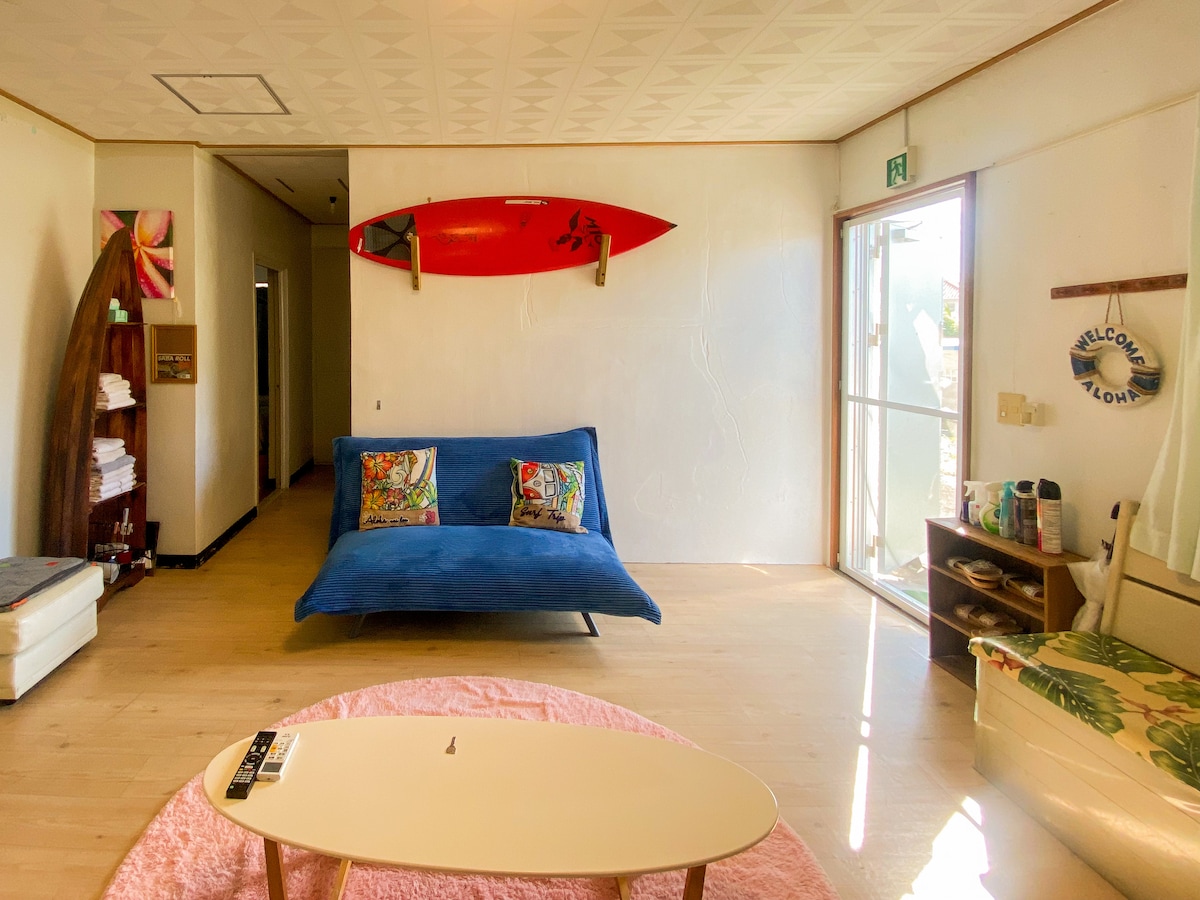 Kemudahan ini berada di lokasi utama, 30 saat berjalan kaki ke Pantai Miyagi, terkenal dengan meluncur dan menyelam. Pantai ini juga dalam jarak berjalan kaki, jadi anda boleh menikmati laut setiap hari. Ia hanya 5 minit memandu ke American Village, yang sangat mudah untuk bersiar-siar dan membeli-belah.Di samping itu, di sebelahnya terdapat kafe gaya Amerika yang popular di mana anda boleh menikmati kopi dan snek yang lazat. Bilik ini boleh memuatkan sehingga 9 orang dan menawarkan 4 katil kelamin.Terdapat juga tab mandi bayi untuk kanak-kanak, jadi anda boleh yakin bahawa anda boleh tinggal bersama keluarga anda.Apabila anda bosan mengembara, anda boleh berehat di Amazon Fire TV. Bilik mandi mempunyai mesin basuh dan pengering yang selamat untuk penginapan yang selesa walaupun anda menginap untuk masa yang lama.Kami juga menyediakan kemudahan berkualiti tinggi untuk mengalu-alukan anda dengan setiap perincian. Sila nikmati penginapan yang menyeronokkan dengan laut Okinawa yang indah. Kami menantikan lawatan anda.Anda bebas untuk menempah/bertanya!