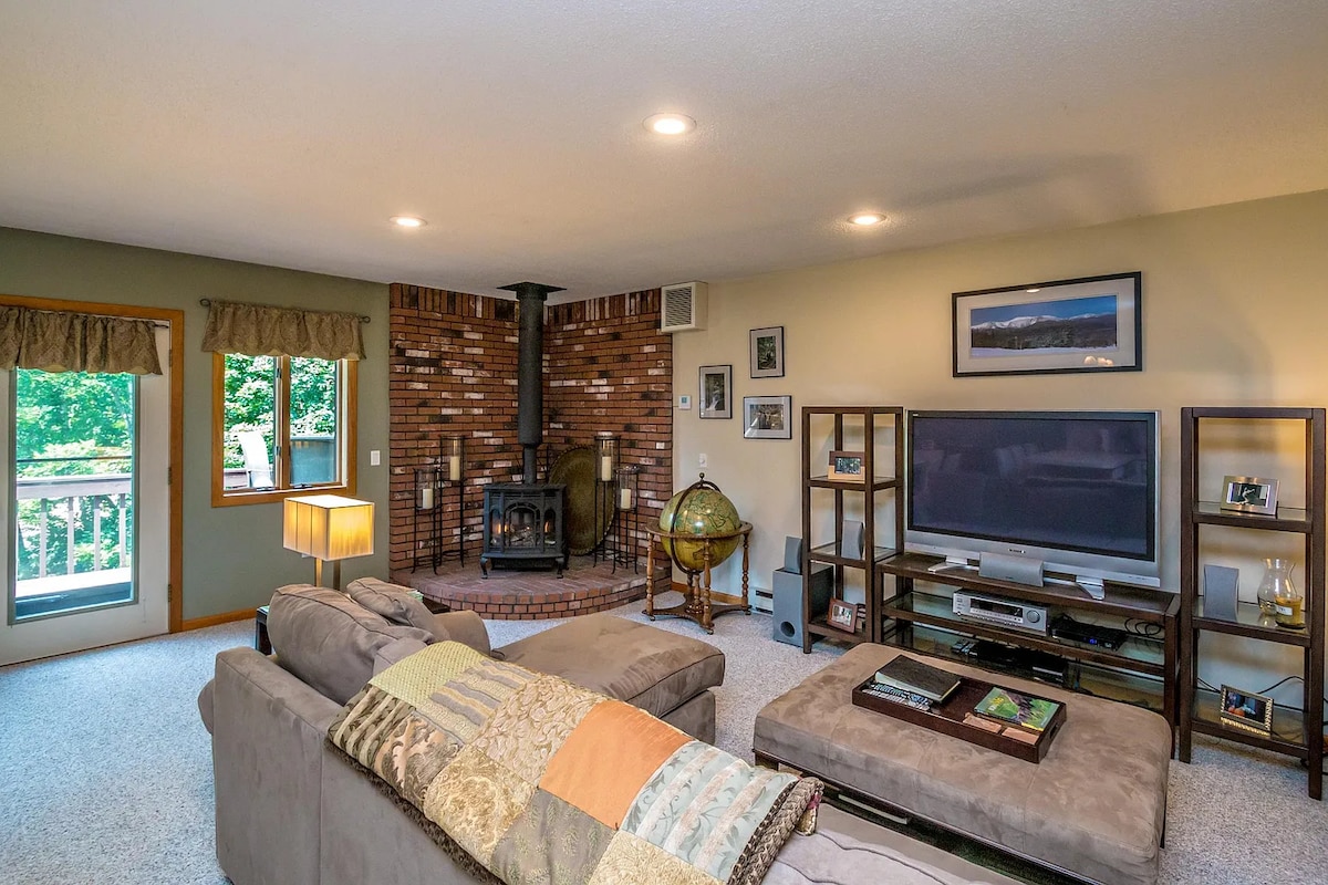 Datang dan nikmati kedamaian, ketenangan, dan keselesaan rumah 4 bilik tidur yang diubahsuai dengan penuh kasih sayang ini. Terletak di 13 ekar dengan pemandangan gunung Pleasant. Berhampiran dengan tasik, pusat bandar Bridgton, 10 minit dari Shawnee Peak, dan 20 minit dari White Mountains. Duduk di tab mandi air panas dan nikmati bunyi alam semula jadi. Bersantai di hadapan api atau menonton filem di TV skrin besar. Sesuai untuk kumpulan besar. Penginapan yang luas dengan ruang untuk permainan luar, berkelah dan unggun api. Tempat ini adalah percutian sebenar!