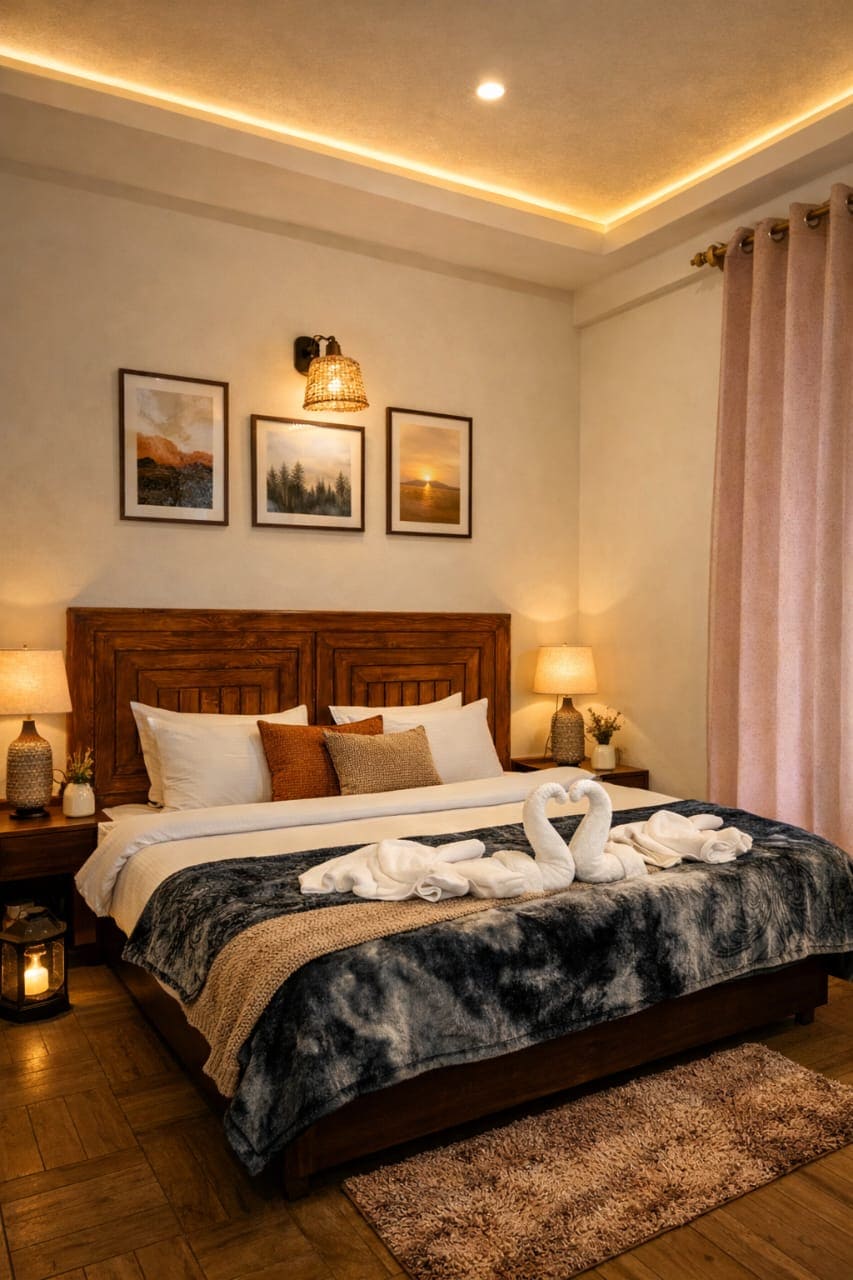 Designed for families and small groups, our spacious Family Room blends modern comfort with warm mountain aesthetics. The room features a plush king-size bed and an additional sleeping area, making it ideal for parents traveling with children or friends staying together. Room Highlights: • King-size bed + extra sleeping space • Spacious layout with wooden interiors • Cozy seating area • Large windows with peaceful views • Flat-screen TV & wardrobe • Clean, modern attached bathroom