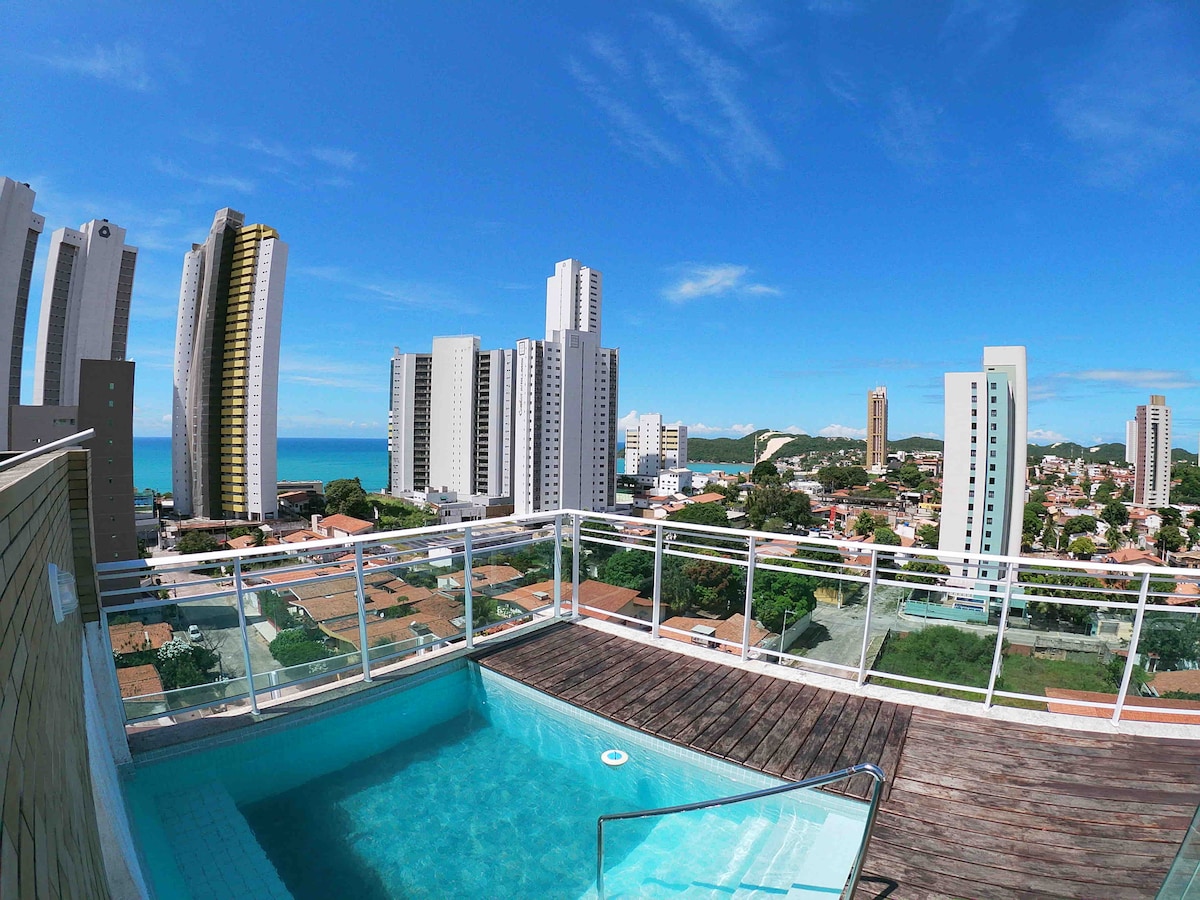 Nikmati penginapan anda di Natal, di penthouse standard yang tinggi, 11 tingkat, pemandangan laut yang indah, dengan dua suite, semua berperabot , penyaman udara berpecah di suite, kawasan gourmet dengan balkoni tertutup, dengan kolam renang persendirian dan barbeku persendirian. Kami mempunyai TV kabel, Wi-Fi, semua peralatan dapur, di Ponta Negra, 400mts pantai, lokasi yang hebat, berhampiran dengan restoran, bar, pusat membeli-belah,kedai roti dan kafe terbaik, di tengah-tengah Ponta Negra, serta, garaj persendirian.