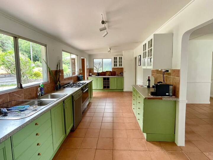 ** PEACE amongst NATURE ** Modern architect-designed hinterland holiday home over 2 levels, with views from every room, including the double spa in the bathroom. There is a full kitchen. 2 of the 4 bedrooms are furnished with queen beds, the other 2 bedrooms have single beds with trundles. The property is approximately 1.25hrs drive from Brisbane CBD (1.5hrs from Brisbane airport) and just under 1 hr from the Gold Coast airport. Gold Coast beaches approx. 40mins from the house.