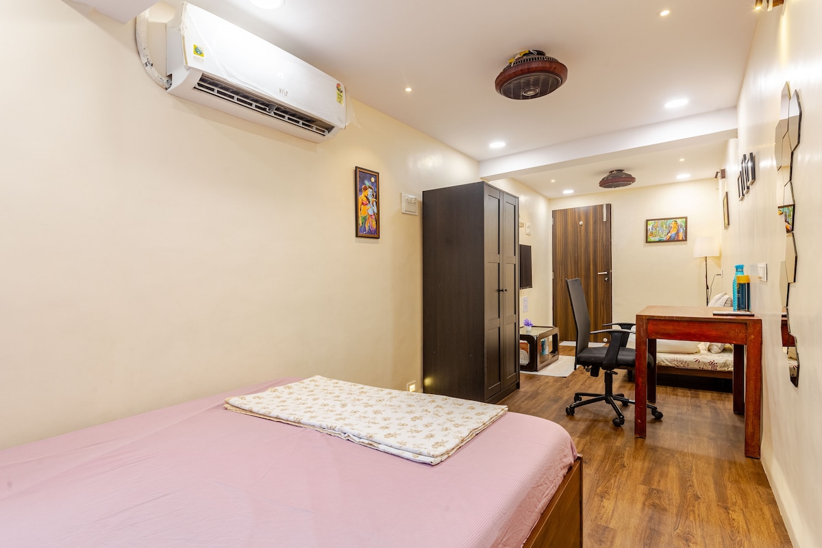 Selamat datang ke Studio Bertema New York kami di Hiranandani Estate, Thane—menghidupkan suasana bandar dan reka bentuk yang anggun kepada penginapan anda. Nikmati katil mewah, katil sofa, TV pintar, Wi-Fi, dapur lengkap, mesin basuh dan pengemasan harian. Kelengkapan dandanan diri, tuala yang dicuci dengan wap, dan keselamatan berpagar 24/7 disertakan. Hanya beberapa langkah dari kafe, restoran, dan “The Walk.” Sesuai untuk perjalanan kerja, rawatan atau percutian gaya bandar.