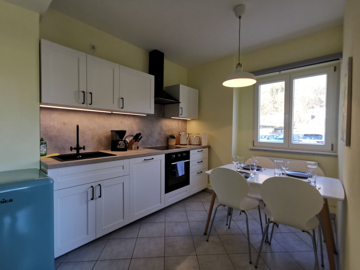 Dies ist eine liebevoll renovierte kleine Wohnung in einem alten Steinhaus im Zentrum der historischen Bergfeste Dilsberg. Steige, Klein, niedrige Decke 205 cm, (in der Dusche nur 190), unzureichender Schallschutz durch Altbau, alte Fenster, neben ist die Kirche, die stündlich schlägt... Aber es gibt alles, was Sie brauchen: ein Bett 150x190 cm, eine kleine Toilette und eine kleine Dusche, eine komfortabel ausgestattete Küche.