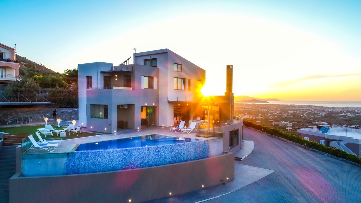 Di sebelah Chania (Crete), dua tingkat dimiliki secara persendirian 300 m. vila mewah, dengan kolam renang dan kawasan letak kereta. Ia terletak di halaman persendirian seluas 4,000 meter persegi dengan pokok zaitun, oren dan lemon, sangat dekat dengan kawasan alam semula jadi "Agia Lake" yang dilindungi. Pada jarak kira-kira 4km anda akan menemui dua pantai berpasir yang paling tersusun di kawasan Chania. Terdapat stesen bas di 200 meter dari vila dengan perkhidmatan tetap ke Chania, di mana anda akan menemui sambungan ke semua bahagian Crete.
