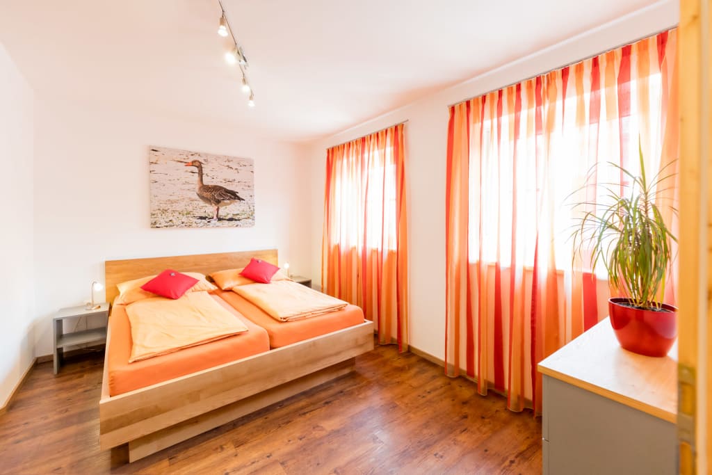 Enjoy your holiday in our cosy Rohrung holiday apartment. Lovingly appointed with great attention to detail and warm colours. Simply relax. Young and old can feel right at home in our wheelchair-accessible, sunny apartments. The quiet location of the bedrooms makes for a long night's sleep. The fully equipped, cosy kitchen is ideal for feasting and playing in. (2 double rooms each with own shower/WC, sofa bed in the kitchen; new: airconditon!) For a booking of 2 people, the second bedroom is no