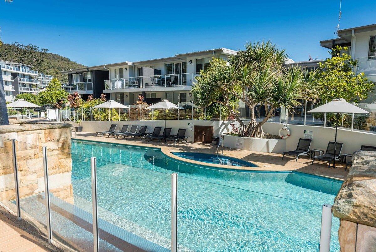 Enjoy spectacular sunrises & sea views, spot koalas, dolphins and birdlife from this spacious tree-height beautifully furnished 2 bedroom (beds made) and 2 BATHROOMS apartment. Surrounded by near-deserted beaches, pool onsite. Short stroll to the Marina for amazing sunsets, cafes, restaurants, boat hire and tennis courts. Walk to Bannisters/Cheeky Dog Pub and the Bowling Club w. courtesy bus. TOWELS are NOT included but can be provided for an extra fee if required - enquire prior to arrival.