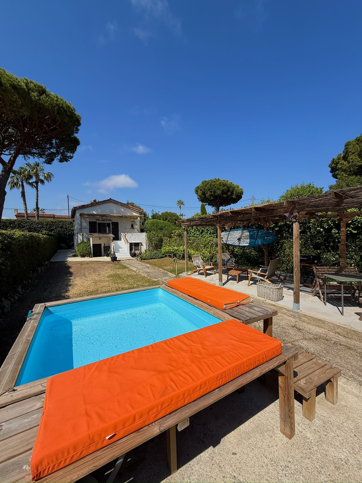 Rumah pantai penuh karakter 50m dari plage des pêcheurs, dikelilingi oleh alam semula jadi. Dapur yang serba lengkap, 3 bilik tidur, 2 bilik mandi dan ruang tamu yang cerah, seluruh penginapan berhawa dingin. Teres yang cerah dikelilingi oleh taman tropika dengan kolam renang, barbeku dan meja ping pong. Dobi mempunyai mesin basuh dan pengering. Lokasi utama di Cap d’Antibes, 10 minit berjalan kaki ke pusat Juan-les-Pins, 1 minit dari pantai. Katil bayi disediakan jika perlu. 3 tempat letak kereta persendirian.