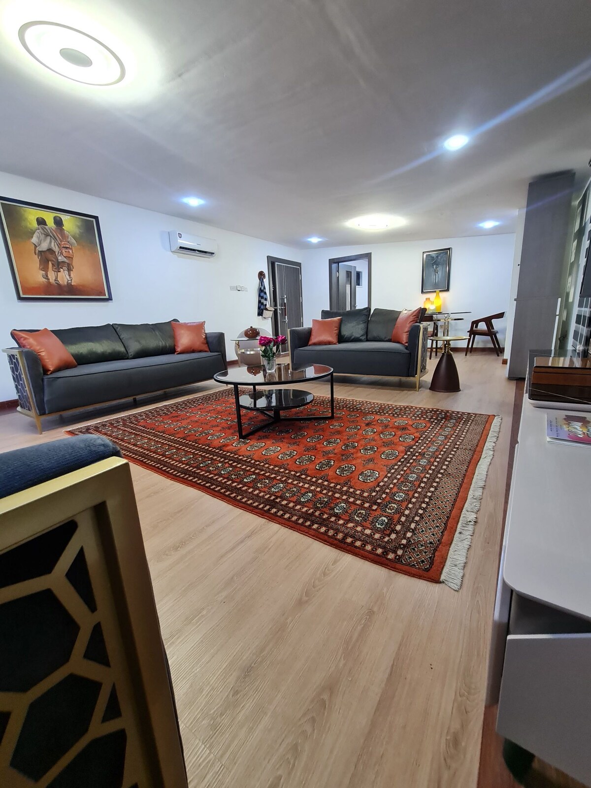 Setiap bilik ensuite menawarkan TV 50", langsir gelap & bilik mandi persendirian, manakala ruang tamu yang luas mempunyai sofa mewah, TV 70" & PS5 untuk keseronokan dalaman. Langganan Netflix, Prime, YouTube & DSTV. Masak dengan mudah di dapur yang lengkap, atau berehat di balkoni persendirian. Dengan akses ATAS BUMBUNG, kuasa 24/7 dengan penjana sandaran dan solar, Wi-Fi tanpa had percuma, ruang kerja khusus, kunci pintar & daftar masuk sendiri, pendingin hawa di semua bilik termasuk dapur, tempat letak kenderaan & pembersihan percuma.
