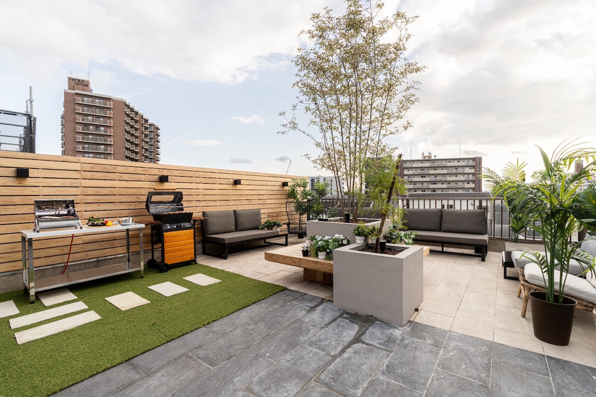 大阪駅梅田エリア徒歩圏内/和室(高級畳)と庭園ビューのあるモダンな和洋室/自転車レンタル無料