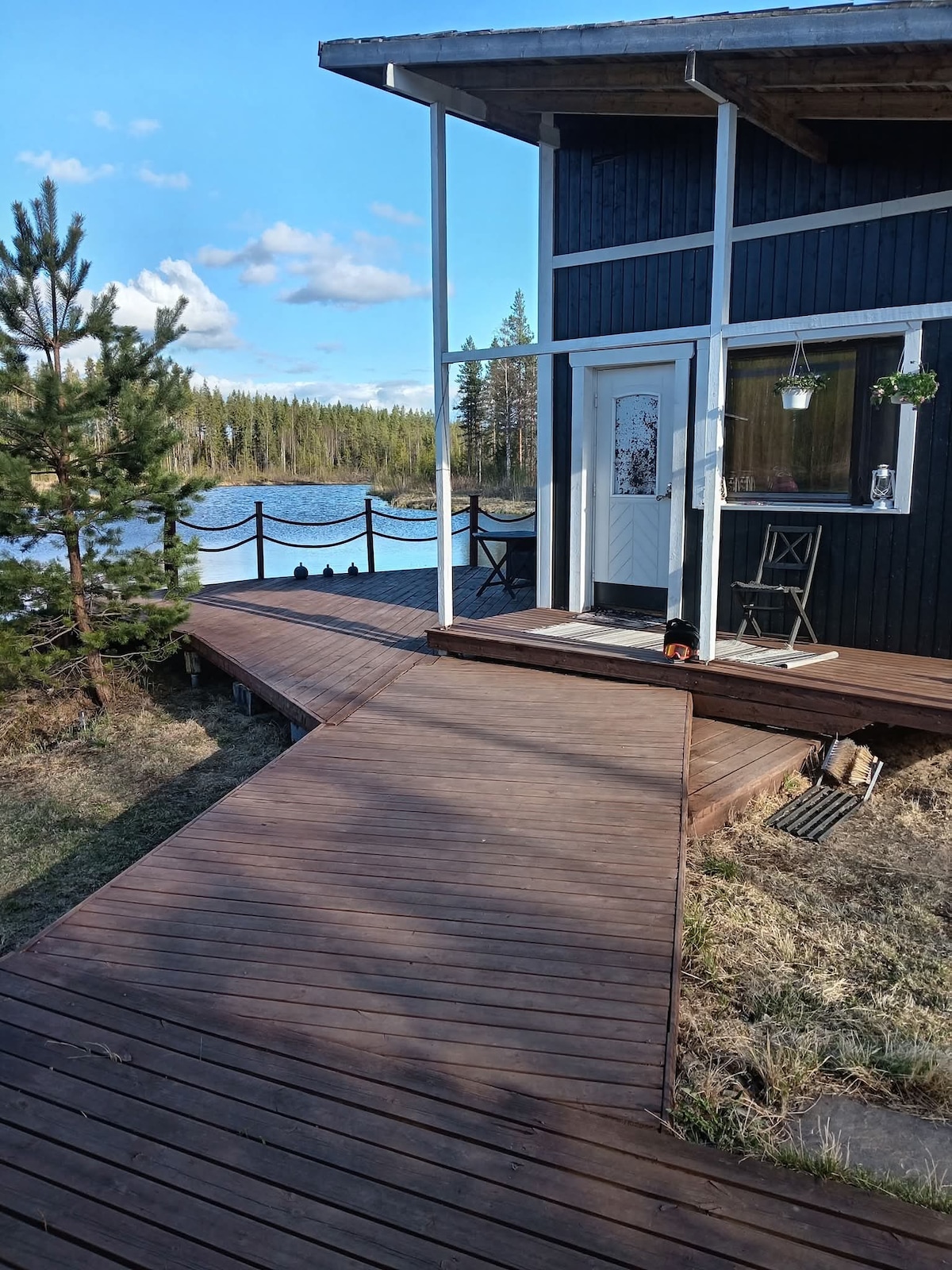 Kabin kayu yang luas (120m2) dalam ketenangan kawasan desa. Sesuai untuk keluarga dan mereka yang mencari percutian yang tenang. Kotej ini mempunyai 6 katil dan 3 bilik tidur. Dua katil double dan dua katil bujang. Kotej ini mempunyai sauna yang dipanaskan oleh pokok, ada banyak perkaitan dengan sauna tepi tasik. Banyak perkara termasuk dalam harga sewa mingguan, pada hujung minggu untuk harga tambahan. Dapur yang lengkap dengan mesin basuh pinggan mangkuk, dapur musim panas mempunyai pendiang api, dapur kayu, dan penunu gas untuk kuali bawah dinding.