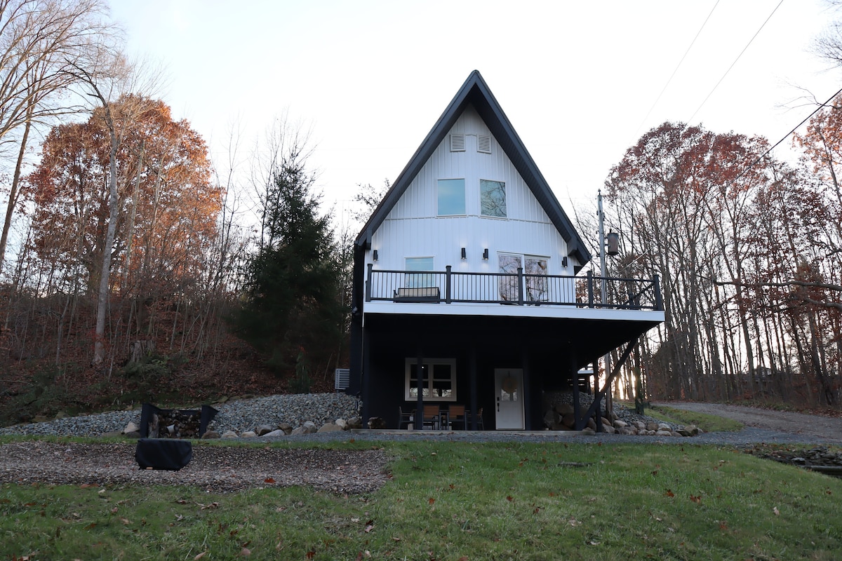Come hibernate to a cozy one bedroom, 1 bathroom, bear den situated across the road from Wolf Run State Park. This cabin is fully equipped with WIFI, stocked kitchen (you bring the food), fire ring, & charcoal grill. This cabin sleeps three (full bed & a pull out couch). Get your paws on a cup of coffee/tea as you sit on the front porch and take in nature all around. The cabin is located just 15 minutes from "The Wilds" & the AEP recreation land is nearby for anglers to enjoy.