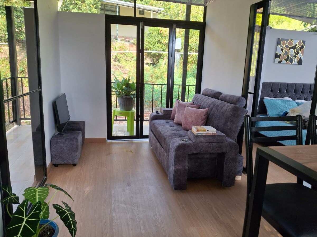 "Suite entre los árboles", diseñada por el artista Denis Aleksandrov. Cama queen, área social, cocina equipada. A 1700 metros, en la cima del cerro , la casa de autor ofrece vistas panorámicas hacia El Tablazo y los valles de San Francisco, la Vega y Gualivá. Con suerte, divisarás el Parque de los Nevados y la fumalora del volcán Nevado del Ruiz. Clima cálido y noches frescas y sin zancudos.