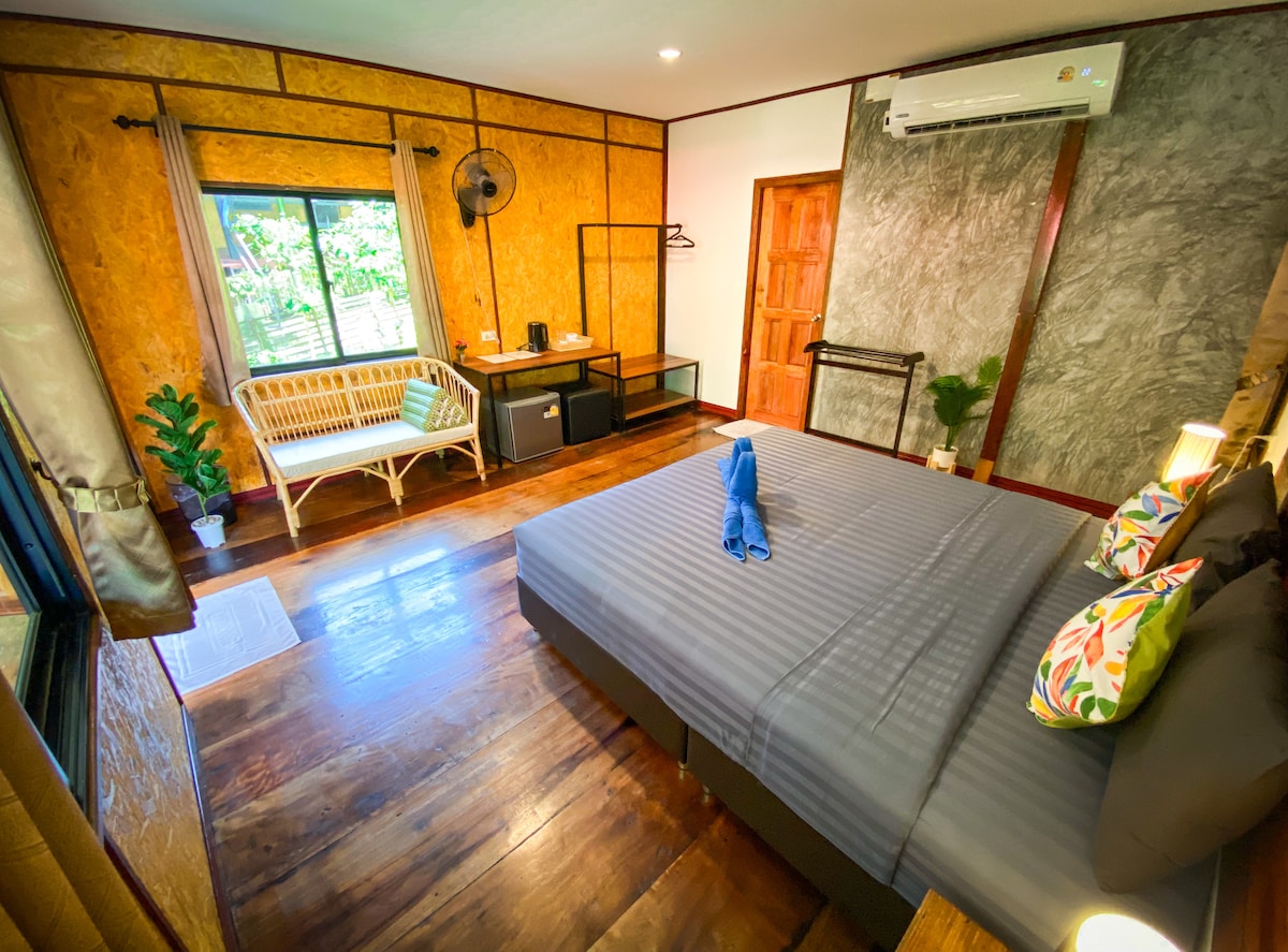 Bilik ini mempunyai satu katil besar, TV, penyaman udara, patio, pancuran mandi, tandas, gelas, gel mandi, syampu, alas kaki pantai, teh, kopi, cerek dan almari pakaian. Kami mempunyai basikal, motosikal dan kereta untuk disewa. Kami boleh mengatur pemindahan dari lapangan terbang Krabi dan Phuket dengan harga terbaik Meja sambut tetamu kami dibuka setiap hari 24/7 Pembersihan harian percuma dan air percuma Di dalam bilik ini anda boleh menghabiskan percutian romantik atau datang bersama keluarga anda.