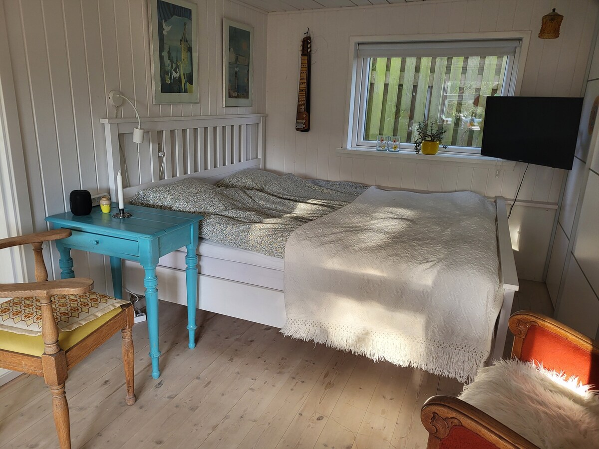 16 m2 anneks i seperat bygning i dejlig have på rolig vej - perfekt til to. Smagfuldt indrettet med lokal kunst og unikke trædrejerprodukter. Komfortabel seng (140x200 cm). Mulighed for tilkøb af morgenmad. Tekøkken med elkedel, kaffe/te, mikroovn, køleskab og service. Badeværelse/toilet deles med vært og er beliggende i kælderen i villaen få skridt væk med separat indgang for gæsterne. Tæt på togstation, indkøb og restauranter. Ca. 12 km til hav/strand. 15 min kørsel til Hirtshals.