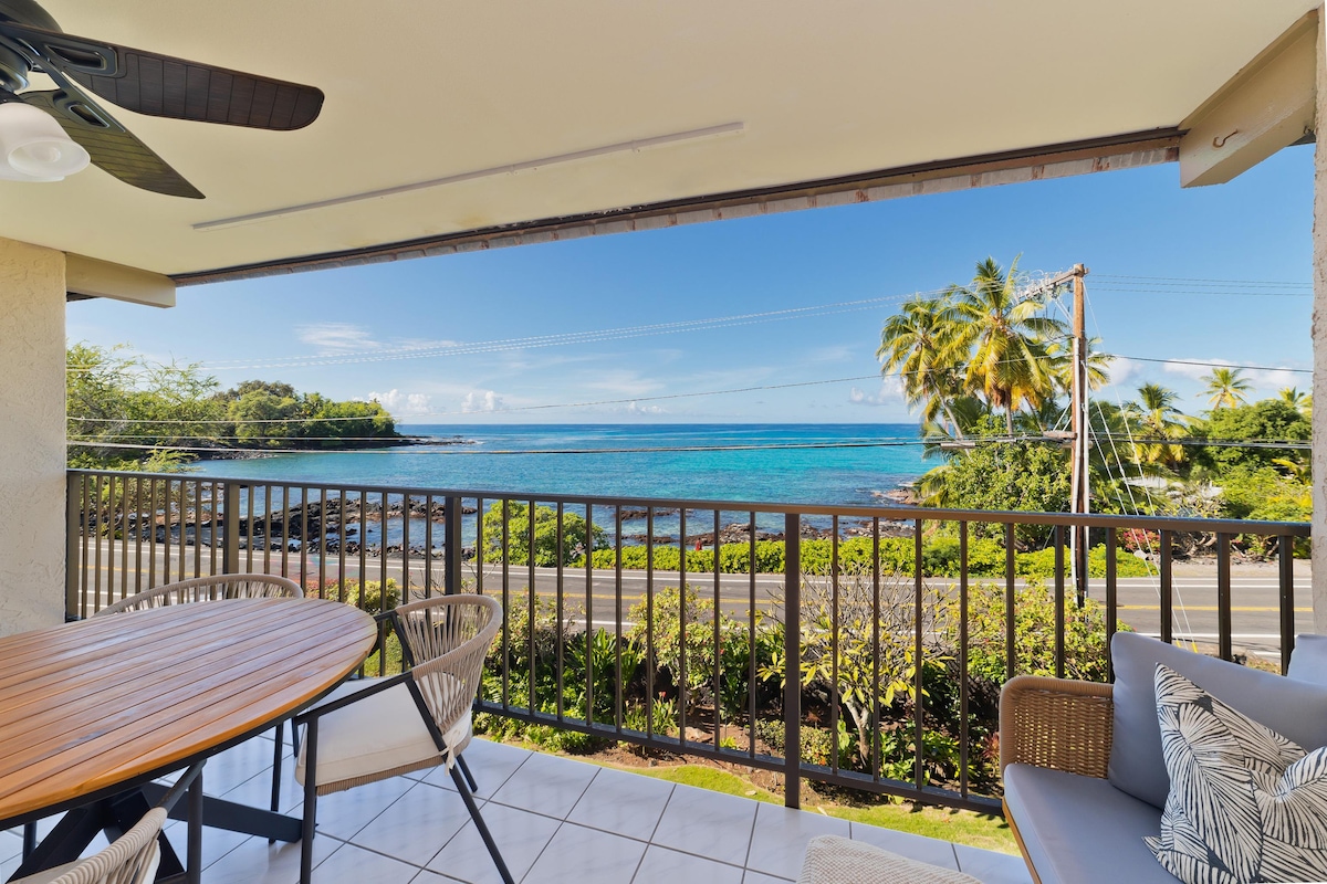 Crashing waves lull you to sleep in our OCEANVIEW Spacious 687sf condo. Steps to the water at the tropical Ocean Front Kona Makai. Our 2nd floor condo sleeps 4 with a King bed in the bedroom + Queen pullout sofabed in the living room. 2 A/C's + fans in each room to keep you cool. W/D in Condo and Full kitchen. Pool & Spa. Beautiful garden view. Gorgeous Oceanview from the Kitchen & Lanai to enjoy the Kona sunset or step down to the lava cliffs for bbq sunset dining! Photos don't do it justice!