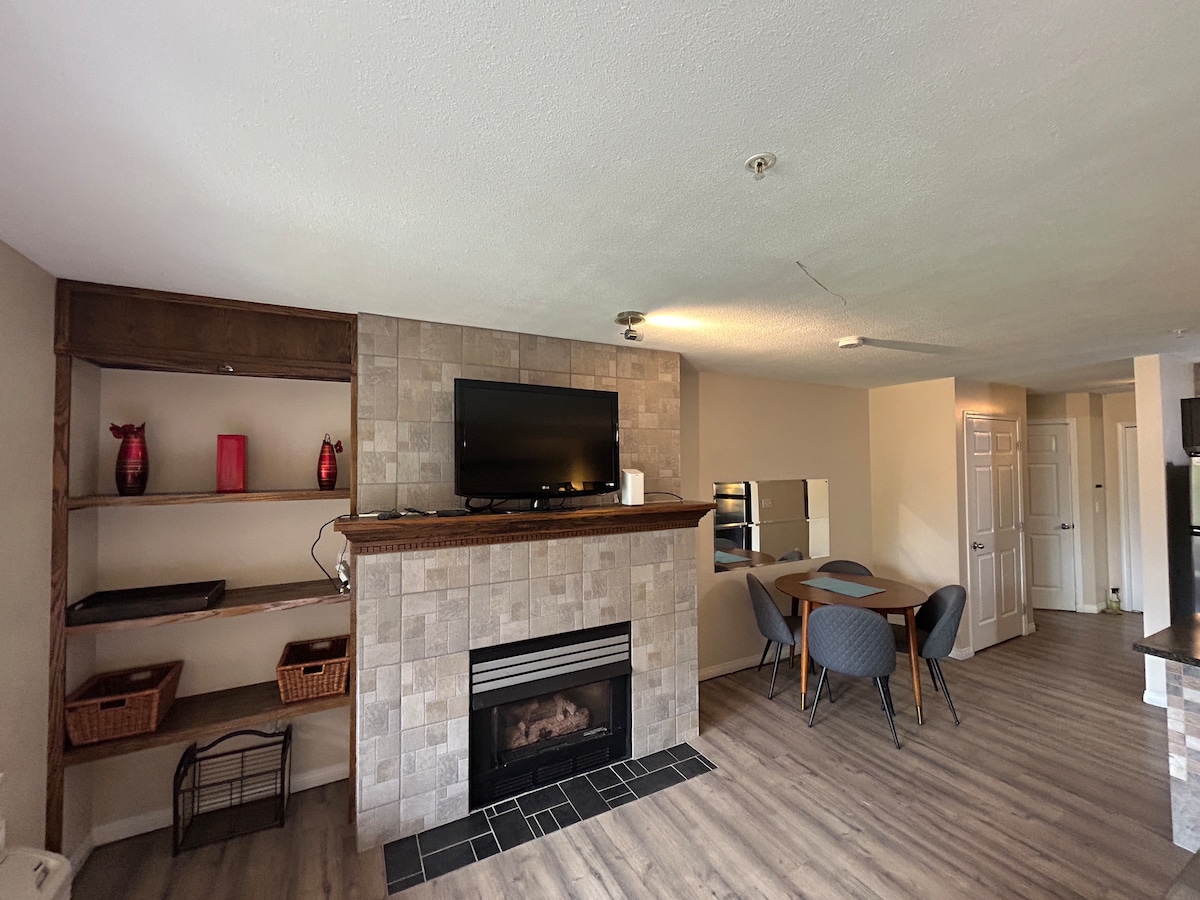 Kondo ini akan membuat anda berasa selesa seperti di rumah semasa bercuti. Dapur mempunyai semua yang anda perlukan untuk hidangan yang lazat, dengan peti sejuk dan dapur bersaiz penuh serta semua pinggan mangkuk dan peralatan anda! Ruang ini menampilkan lekapan unik seperti ruang makan dinding terbina dalam, dinding berwarna kelabu, dan pendiangan dalam suite. Ruang ini menawarkan suasana yang bergaya namun berkelas. Teres yang cantik ini menampilkan barbeku dan meja makan untuk 2 orang. Nikmati segelas wain Okanagan atau bir kraf sambil duduk di patio luar yang besar.