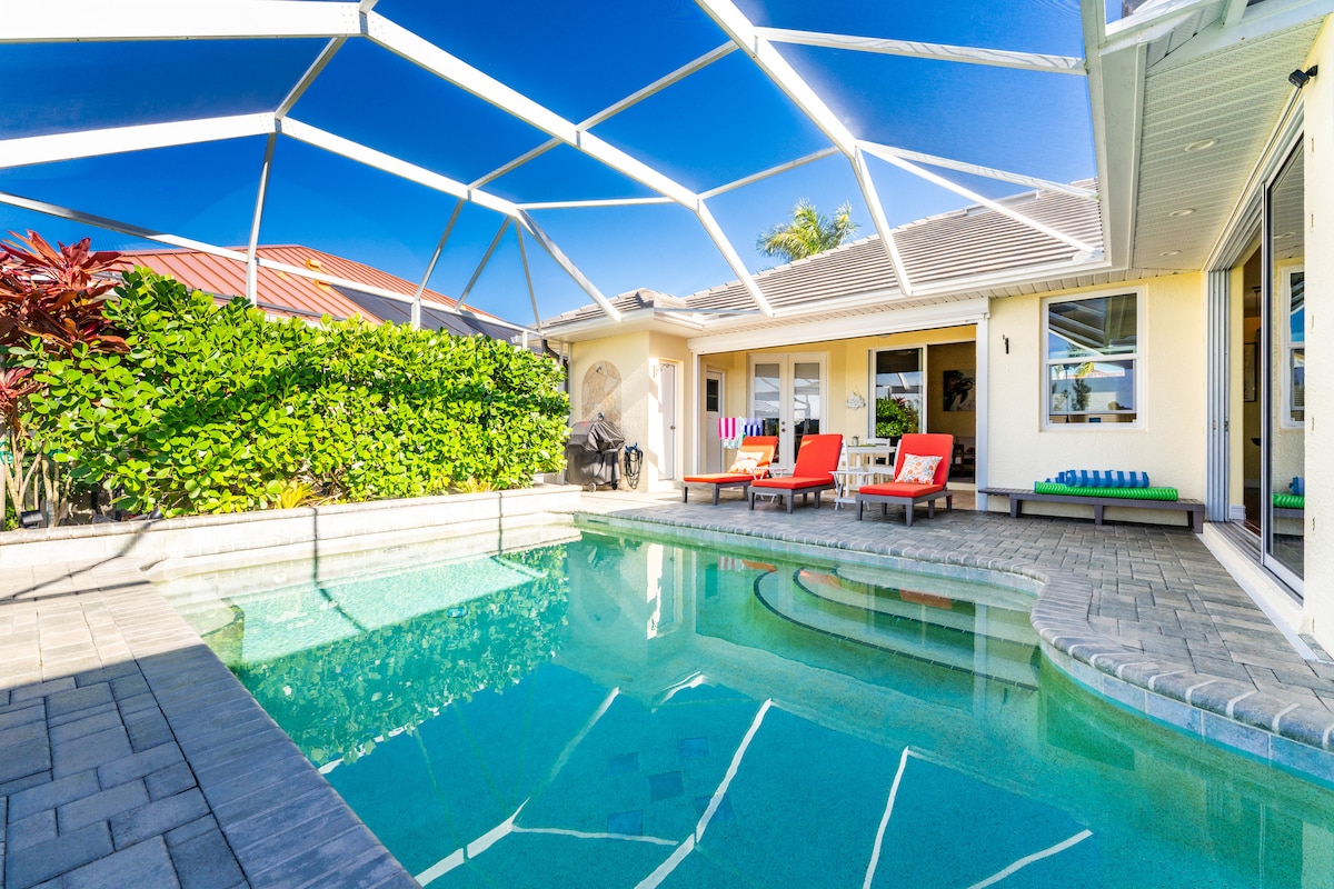 Welcome to Golf Cove Paradise ☀️ A peaceful resort style outdoor space + private + oversized solar heated pool creates a perfect vacation oasis. Covered lanai = shade. BBQ & watch your favorite sports on 55” outdoor tv. Walk the golf cart paths, swim laps, get a tan, read a book, play music & games, sip on tropical drinks & float all your cares away. Pretty sunsets overlooking a golf course setting. A.M. coffee outside to hear the birds sing. Carefree outdoor living is what it’s all about here.