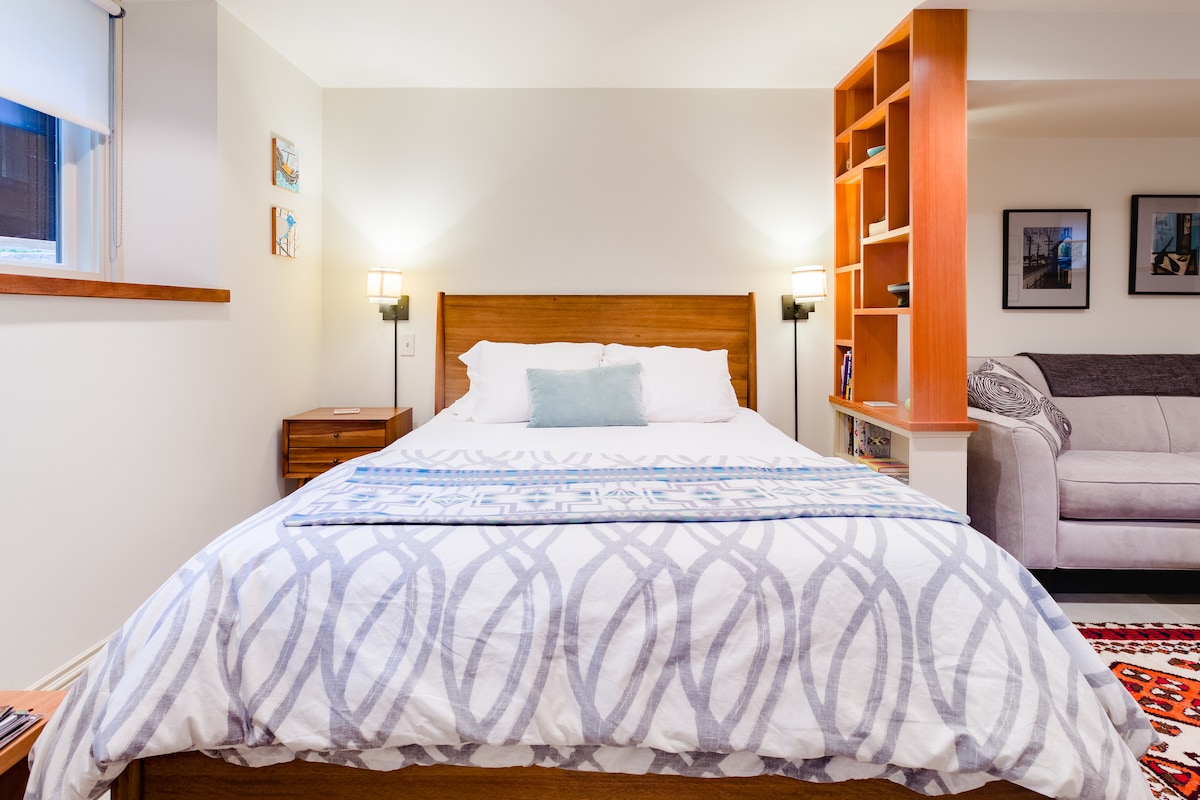 Suite tetamu tingkat bawah tanah yang direka bentuk dengan teliti, selesa, dan diubahsuai yang terletak di Northeast Portland. Anda mempunyai pintu masuk persendirian anda sendiri dengan tempat letak kereta percuma di tepi jalan yang mudah. Kurang daripada 15 minit jarak memandu dari I-5, Pusat Moda, Pusat Konvensyen, lapangan terbang PDX, restoran, taman dan kedai kopi! Perhentian bas yang mudah beberapa minit berjalan kaki. Beritahu kami jika anda mahu cadangan tertentu.