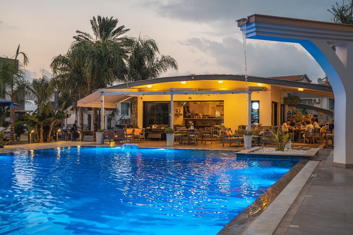 Villa in the TOP Airbnb, belongs to ancient Reinecke family. 5 minutes from the beach, aqua park and casino of Acapulco Hotel, 20 minutes to center of Girne. The house has large cinema, luxurious marble furniture, panoramic views and free electric transport! This exquisite twin-villa (duplex) in gated complex with 3 pools has privat garden, font, ping pong, mangal, swing, trampoline and 2 fountains. There is no big need to rent a car -2 shops, 2 restaurants and a cafe near.