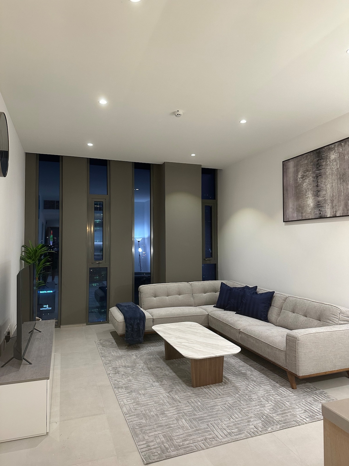 Ciri-ciri Apartmen: • Susun atur luas 96 meter persegi dengan hiasan kontemporari • Balkoni peribadi besar dengan pemandangan panorama • Dapur yang dilengkapi dengan peralatan mewah • Bilik tidur yang selesa dengan katil king size yang empuk dan simpanan yang mencukupi • Bilik mandi moden dengan kelengkapan premium Bangunan & Kemudahan: • Gimnasium & kolam renang terkini • Perkhidmatan keselamatan & pekerja rencam 24/7 • Tempat letak kereta khusus • Restoran, kafe, dan kedai runcit di lokasi Pusat bandar, Seef Mall, The Avenue 5 min jauhnya