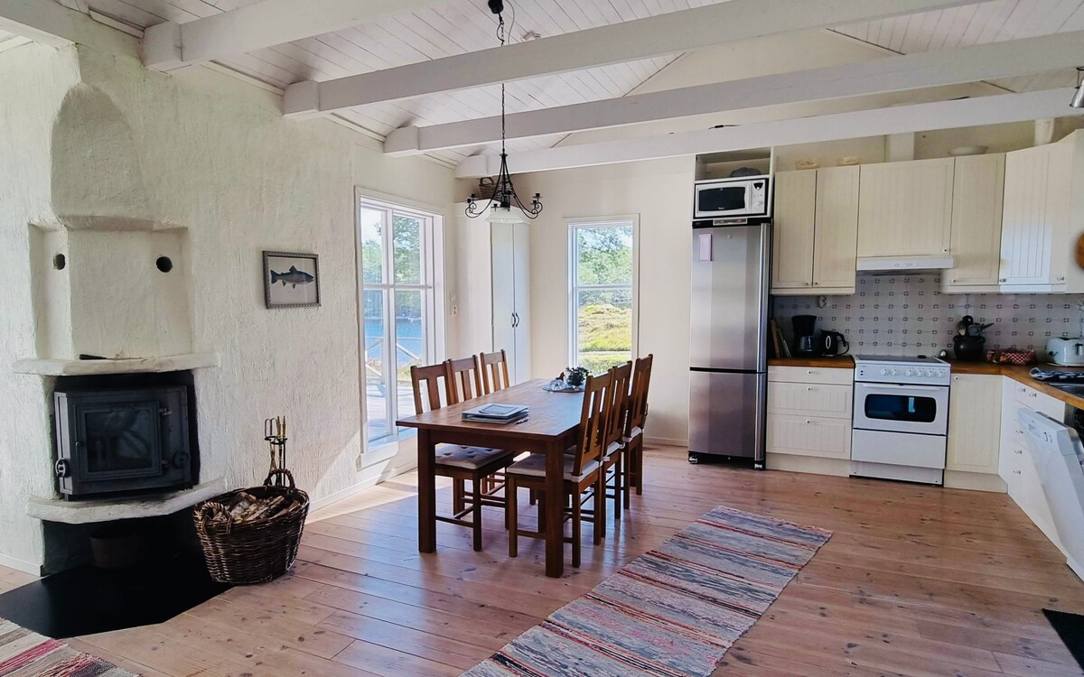 The Lerbukta Cottage is located in undisturbed, idyllic and peaceful surroundings. The Halden watercourse is floating past, and the distance to the lake Ara is just about 30 metres. The cabin is well equipped and has a large sitting room, kitchen, 2 bedrooms, a tiled bathroom with shower, toilet and a washing machine. There is underfloor heating in the bathroom. The sauna is in the side building. The cabin has WiFi.