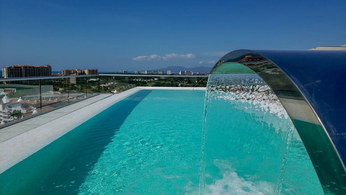 Brand new build 2 Bedroom Condominium located in the Golden Zone of Bucerias, Nayarit. Reka Bentuk Moden, Kolam Infiniti Atas Bumbung & Jakuzi dengan pemandangan Bahia de Banderas yang menakjubkan. Termasuk kemudahan Gimnasium & tempat makan luar & BBQ. Wi-Fi berkelajuan tinggi, Keselamatan & Pekerja Rencam 24-7. Dapur lengkap, mesin basuh pinggan mangkuk, mesin basuh/pengering Bilik Tidur Utama 1 -Katil Saiz Raja, LCDTV Samsung, bilik mandi en suite & unit Penyaman Udara. Bilik Tidur 2 - Katil Saiz Queen, Penyaman Udara, Pemandangan Lautan Separa Bcony Persendirian