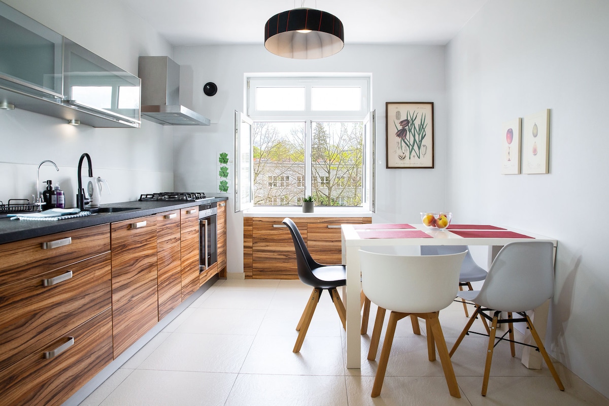 Selamat datang ke apartmen tingkat 1 yang menawan di rumah bandar yang diubahsuai dengan siling bersejarah berusia 130 tahun! Apartmen ini dibahagikan secara fungsi kepada ruang tamu dan ruang tidur. Terdapat dapur lengkap dengan plat panas, mesin pembancuh kopi dengan peti sejuk dan ketuhar gelombang mikro. Ruang tamu mempunyai katil sofa, rumah bio, TV pintar dengan Netflix, dan meja makan untuk empat orang. Apartmen ini terletak di tengah-tengah bandar lama, 3 minit ke Ostrów Tumski, 15 minit berjalan kaki ke pasar!