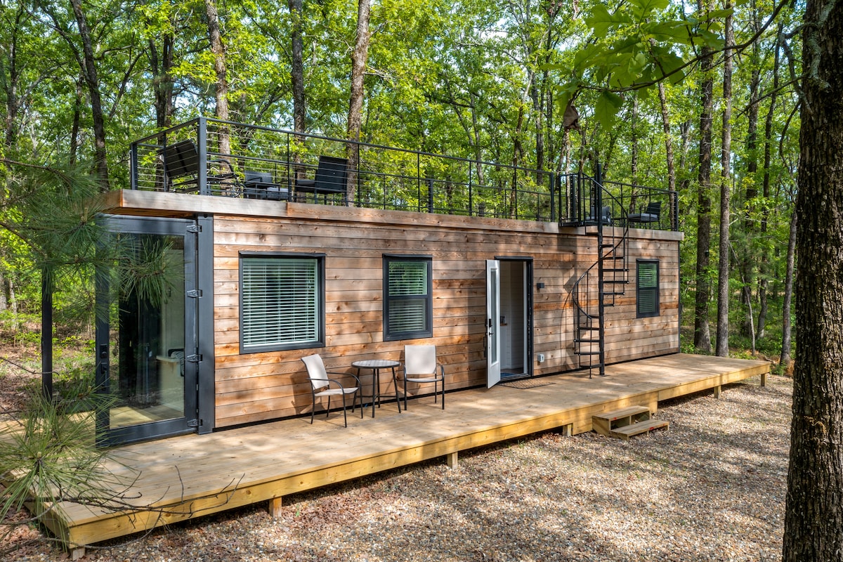 Di sini anda akan menemui kontena perkapalan kiub setinggi 40 kaki yang telah diubah suai menjadi rumah kecil moden. Terletak di kawasan lapang, dikelilingi oleh kayu balak & anak sungai yang mengalir, kontena ini mempunyai dek atas yang membolehkan tetamu mengalami pemandangan langit Oklahoma yang luas tanpa halangan. Di dalamnya anda akan menemui rumah kecil yang beroperasi sepenuhnya. Dilengkapi dengan peralatan saiz penuh & katil saiz queen. Kabin ini terletak hanya beberapa minit dari Winstar World Casinos, The Red River & Lake Murray.