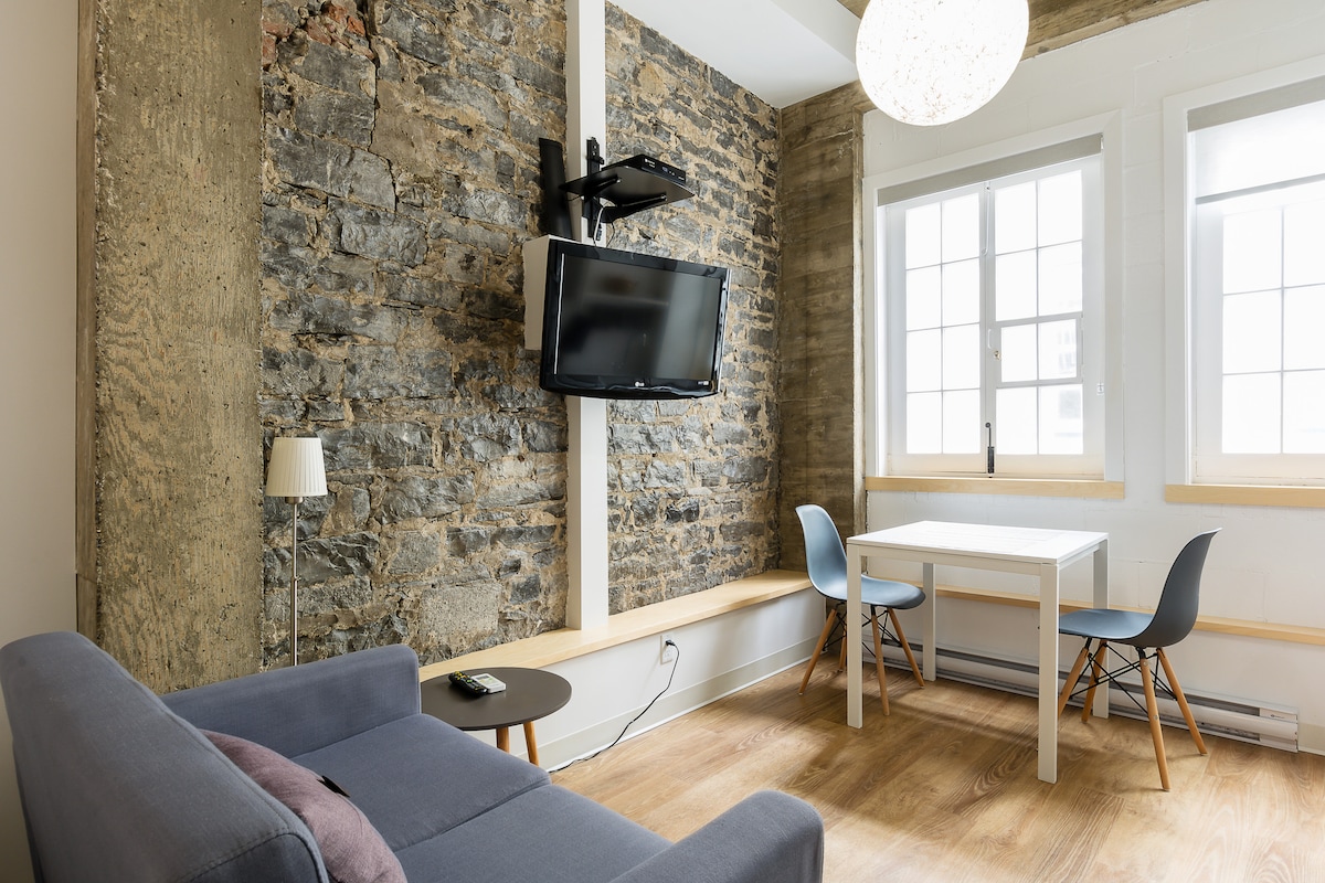 Campuran bata merah dan batu dari dinding asal bangunan yang berasal dari tahun 1911 dengan sentuhan bergaya pengubahsuaian terkini memberikan pengalaman yang sempurna untuk meneroka Quebec. Bukan sahaja kondominium ini sempurna di dalam, anda juga mempunyai teres luar yang sangat besar untuk menikmati aktiviti luar yang hebat. Kondominium ini berukuran 1200 kaki persegi, yang akan membolehkan setiap pelawat mempunyai ruang mereka sendiri walaupun terdapat 6 orang dalam penginapan.