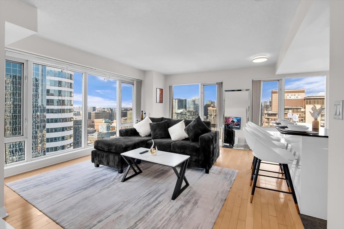 Selamat datang ke percutian bandar anda yang selesa di tengah-tengah Toronto! Kondominium 2 bilik tidur moden dan bergaya ini terletak di daerah hiburan yang meriah, menawarkan anda gabungan keselesaan, kemudahan dan kehidupan kontemporari yang sempurna. Ruang tamu dilengkapi dengan sofa yang selesa, sesuai untuk bersantai selepas seharian meneroka bandar. Nikmati rancangan atau filem kegemaran anda di TV skrin rata pintar 65" yang dilengkapi dengan aplikasi penstriman untuk kemudahan anda.