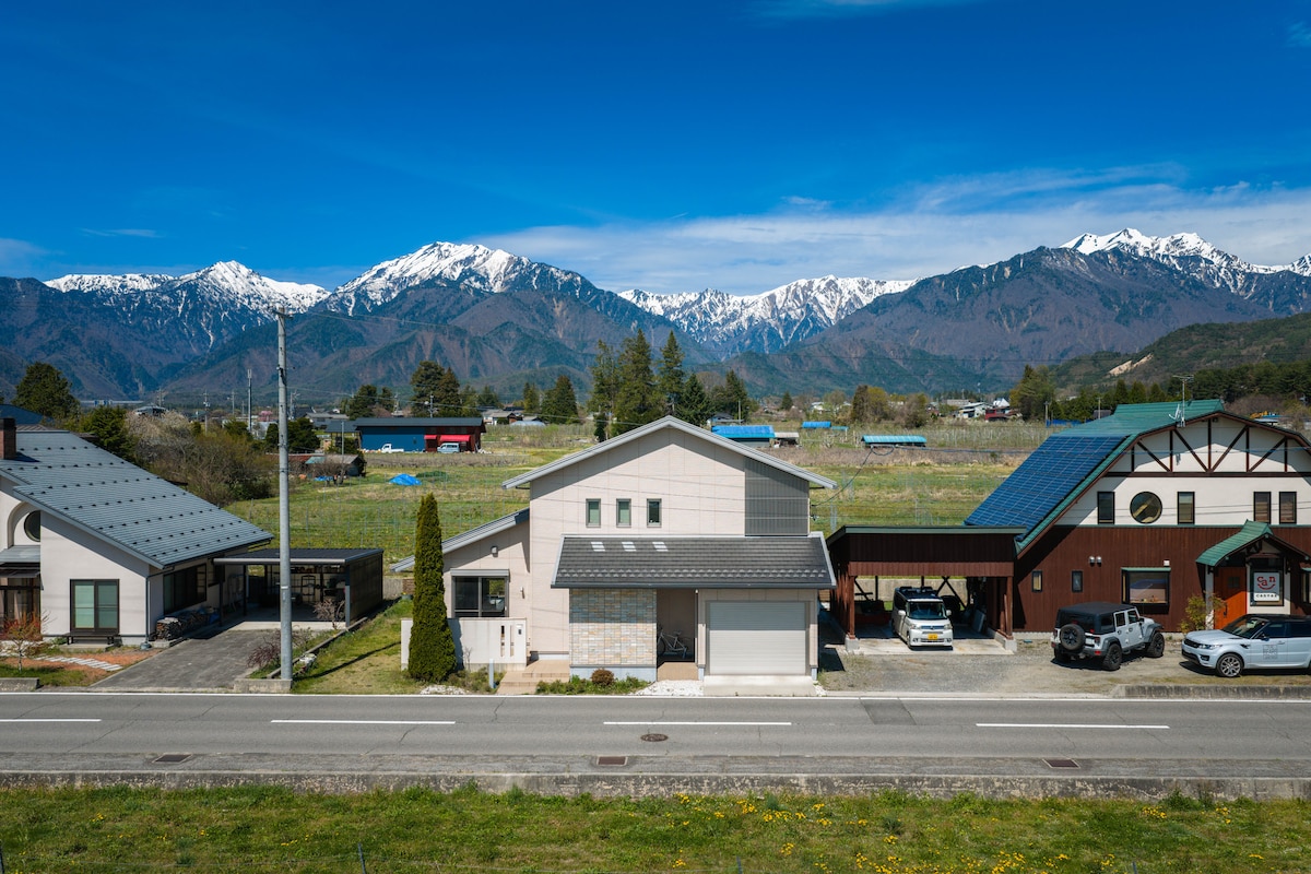 Vila persendirian seluas kira-kira 200 m² di Omachi City, Nagano Prefecture.Di luar tingkap terdapat pemandangan panorama Alps Utara yang menakjubkan, di mana anda boleh menikmati pemandangan indah empat musim.Terletak 13 minit berjalan kaki dari stesen Shinano Omachi, ia kira-kira 30 minit memandu ke kawasan Hakuba, menjadikannya pangkalan yang ideal untuk bersiar-siar dan aktiviti.Di dalam, anda boleh menikmati LDK terbuka lebih 70 m² dan skrin lebih 100 inci.Kami juga mempunyai 3 bilik tidur untuk keluarga dan kumpulan berehat.Sila nikmati masa yang mewah dan selesa dikelilingi oleh alam semula jadi.