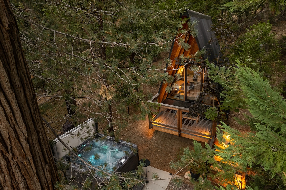 Kabin Berbingkai A Hitam ini terletak tinggi di antara pokok-pokok pain di Running Springs, menawarkan pemandangan puncak pokok yang tenang dari dek di ketiga-tiga tingkat. Dengan reka bentuk moden pertengahan abad yang hangat, ia merupakan percutian romantik yang sempurna. Bersantai di loteng yang selesa, nikmati vinil atau filem di bilik pawagam rahsia, dan berehat bersama di sauna tong baharu. Sesuai untuk pasangan yang meraikan ulang tahun, bulan madu, percutian istimewa, atau hanya menikmati masa yang tenang dan bermakna bersama di dalam hutan.