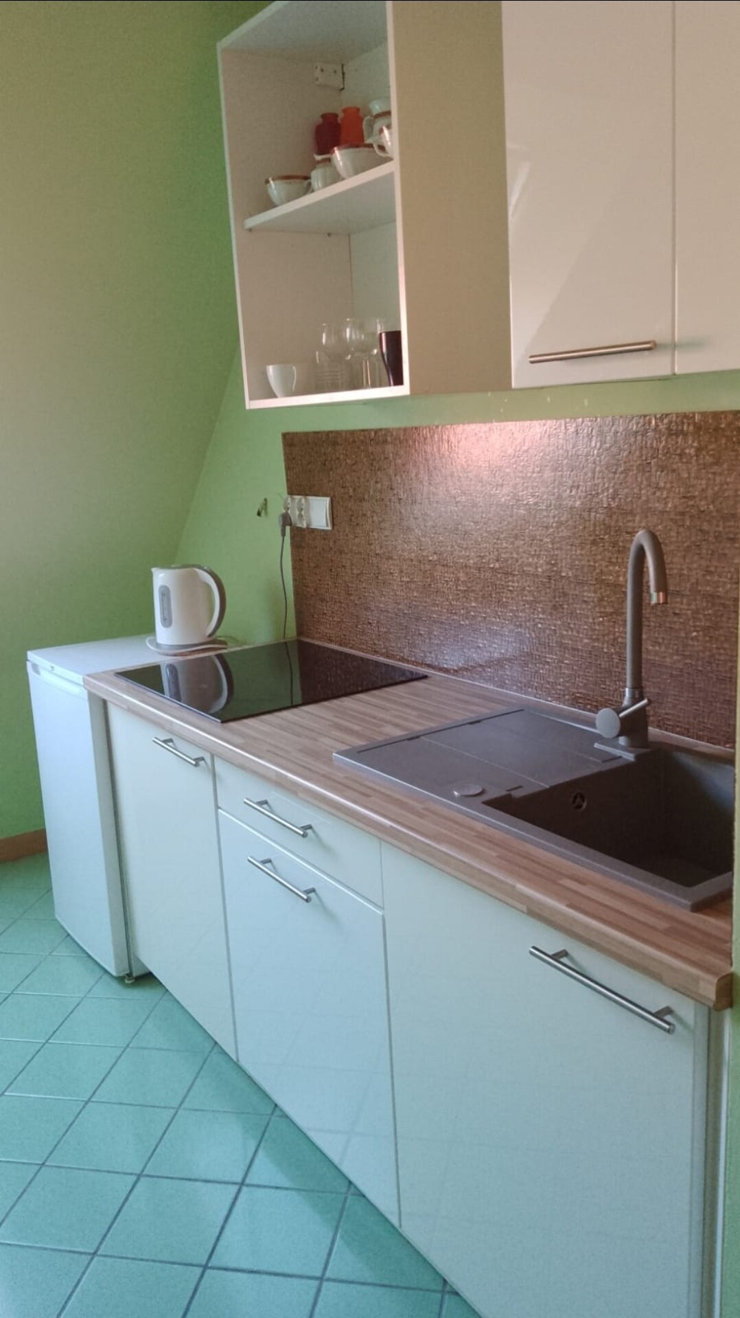 Tawaran ini juga termasuk dapur kecil anda sendiri yang dilengkapi dengan hob induksi dan peralatan yang diperlukan seperti periuk, kuali, cawan dan gelas wain. Dapur kecil juga termasuk peti sejuk dengan peti sejuk beku. Bilik ini berukuran kira-kira 20m2 dan katilnya 140cm x 200cm.