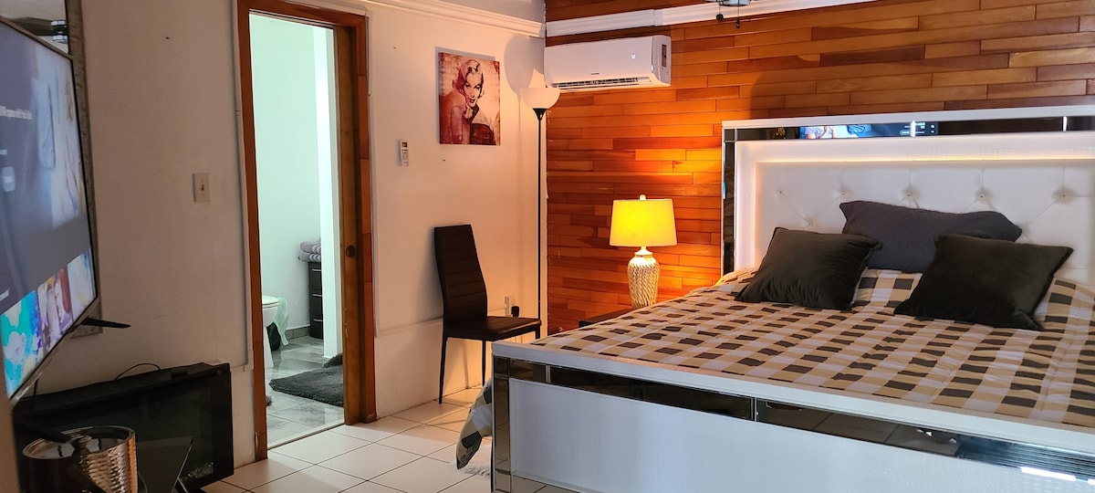 Hello travelers! 😀 We offer a portion of our smoke-free home with a King sized bed, a large private bathroom with a Jacuzzi tub, and a Harry Potter play area accessed by rock climbing wall. The mini kitchen has a microwave, bread toaster, coffee maker, and refrigerator. There's an internet TV in the area with access to Roku. The pool and garden areas are shared with my family and another set of travelers. We are happy to offer our studio to travelers.
