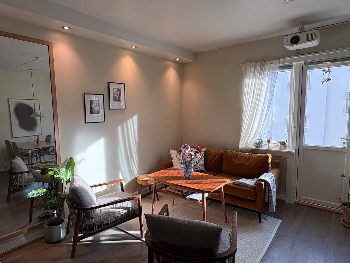 Untuk disewa, apartmen studio yang selesa dan baru diubahsuai di tengah-tengah Olso(36 m²). Apartmen ini sesuai untuk pasangan. Apartmen ini mempunyai dapur lengkap, ruang tamu pelan terbuka dengan meja makan, sofa di kawasan lounge dan dapur pembakaran kayu balak baru. Terdapat katil murphy yang dilipat ke bawah untuk menyediakan katil double untuk tidur dan di sebelahnya terdapat juga almari pakaian terbina dalam. Peralatan tempat tidur disertakan. Terdapat bilik mandi berasingan dengan pancuran mandi gaya bilik basah dan mesin basuh/pengering.