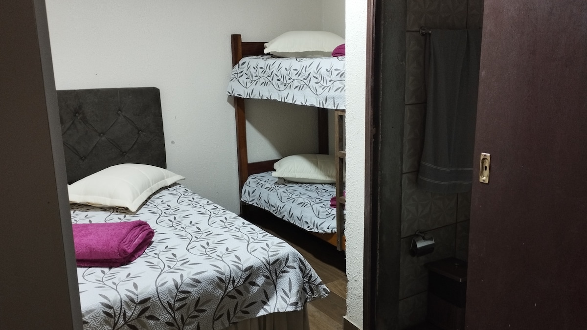 Quarto em pousada com banheiro privativo para até 4 pessoas. O quarto conta com ventilador, roupas de cama, travesseiros, cobertores e toalhas.