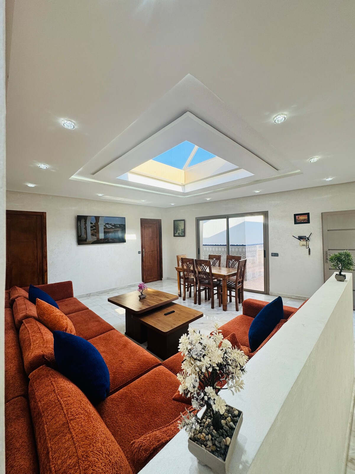 A quelques pas de la plage, une vue sur la montagne d'Agadir Ouffelah, nous louons notre appartement qui comprend un séjour - salle à manger, une cuisine, une chambre, deux salles de bains (baignoire + douche) ainsi une grand balcon.