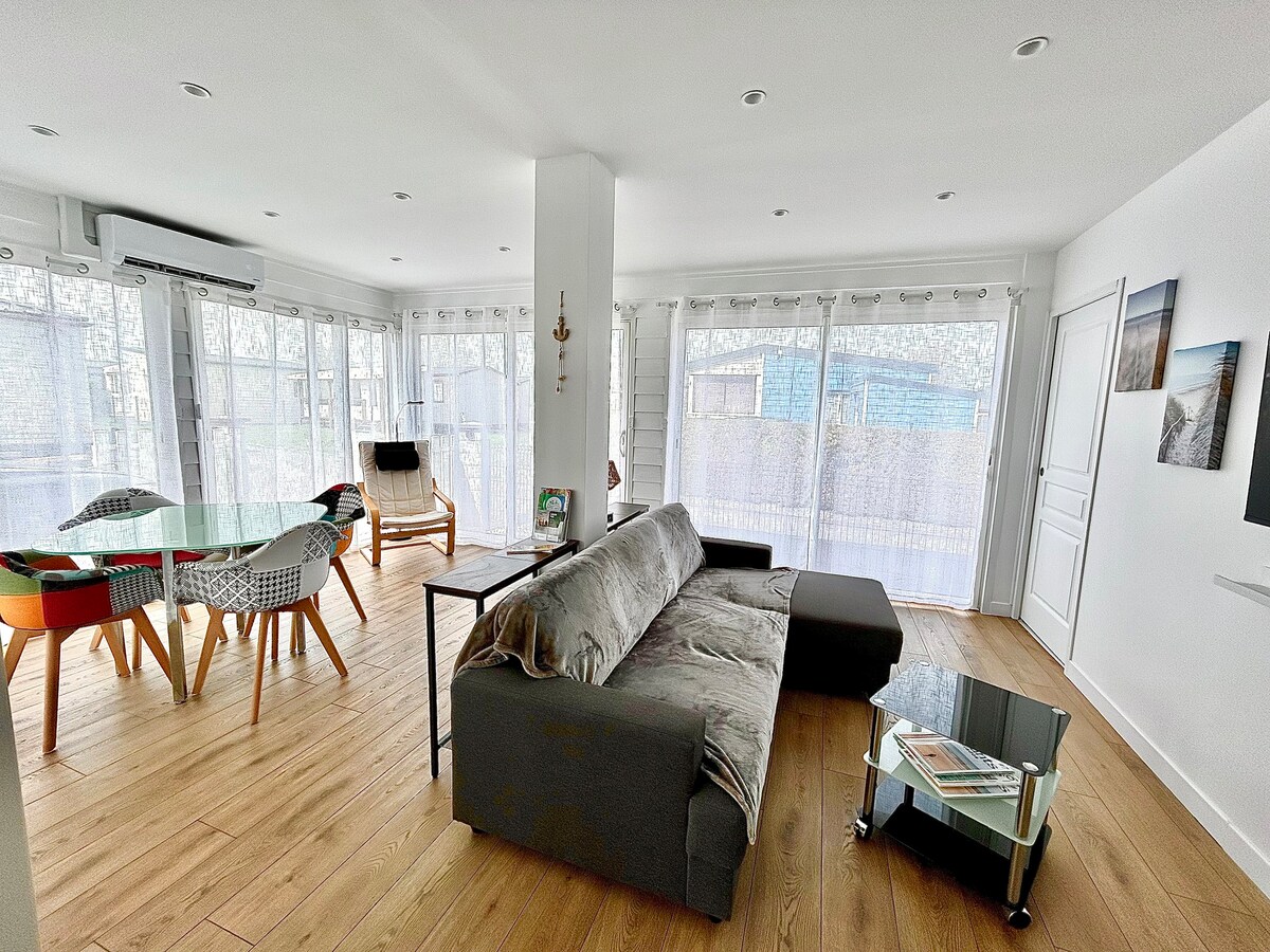 Chalet terletak di resort tepi pantai terkenal Côte de Nacre. Di jalan buntu, 400 meter (5 minit berjalan kaki) dari pantai, kami mencadangkan anda untuk menginap di chalet kayu seluas 40m2 (pembinaan 2020) Dilengkapi sepenuhnya (storan, pinggan mangkuk, TV, internet, mesin basuh, peti sejuk, ketuhar gelombang mikro, kompor induksi, mesin basuh pinggan mangkuk). Sesuai untuk penginapan untuk 2 orang dewasa atau untuk sebuah keluarga dengan 2 kanak-kanak. Bekalan linen (cadar dan tuala) Haiwan dibenarkan (hanya 1) nyatakan ini apabila membuat tempahan