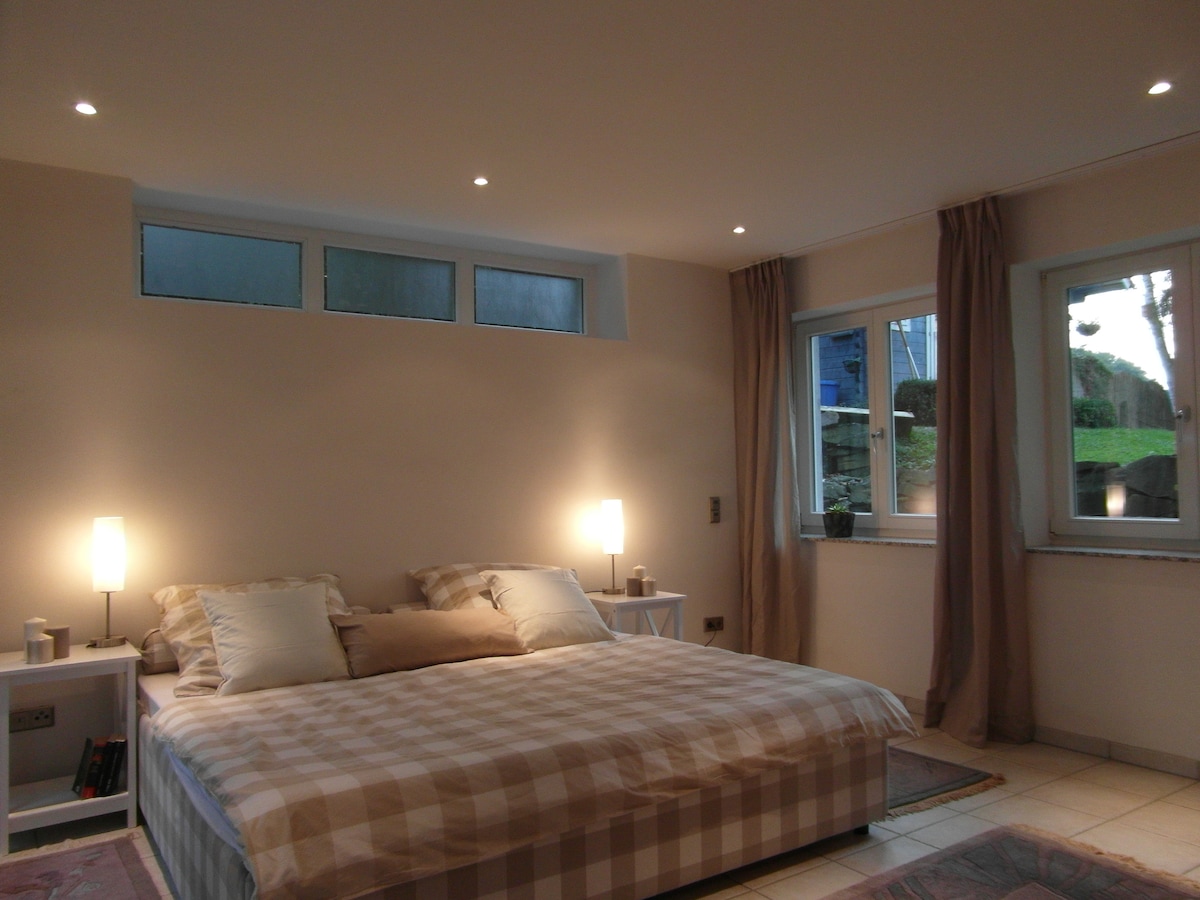 Selamat datang ke ruang yang luas dan tenang ini. Lokasinya indah di luar bandar di pintu gerbang Cologne dan bersambung dengan baik: perhentian bas di hadapan pintu, stesen kereta api dalam jarak 10 minit berjalan kaki (RB25: stesen kereta api utama Cologne atau Deutz Messe 25 minit, lapangan terbang 20 minit). Daftar masuk sendiri, pintu masuk berasingan. Ia adalah ruang yang besar serta bilik mandi dengan pancuran mandi marmar. Sesuai untuk 1 hingga 3 orang, dengan tilam tambahan, 4 orang boleh menginap semalaman dengan mudah. Dilengkapi dengan semua kemudahan dan perpustakaan kecil.