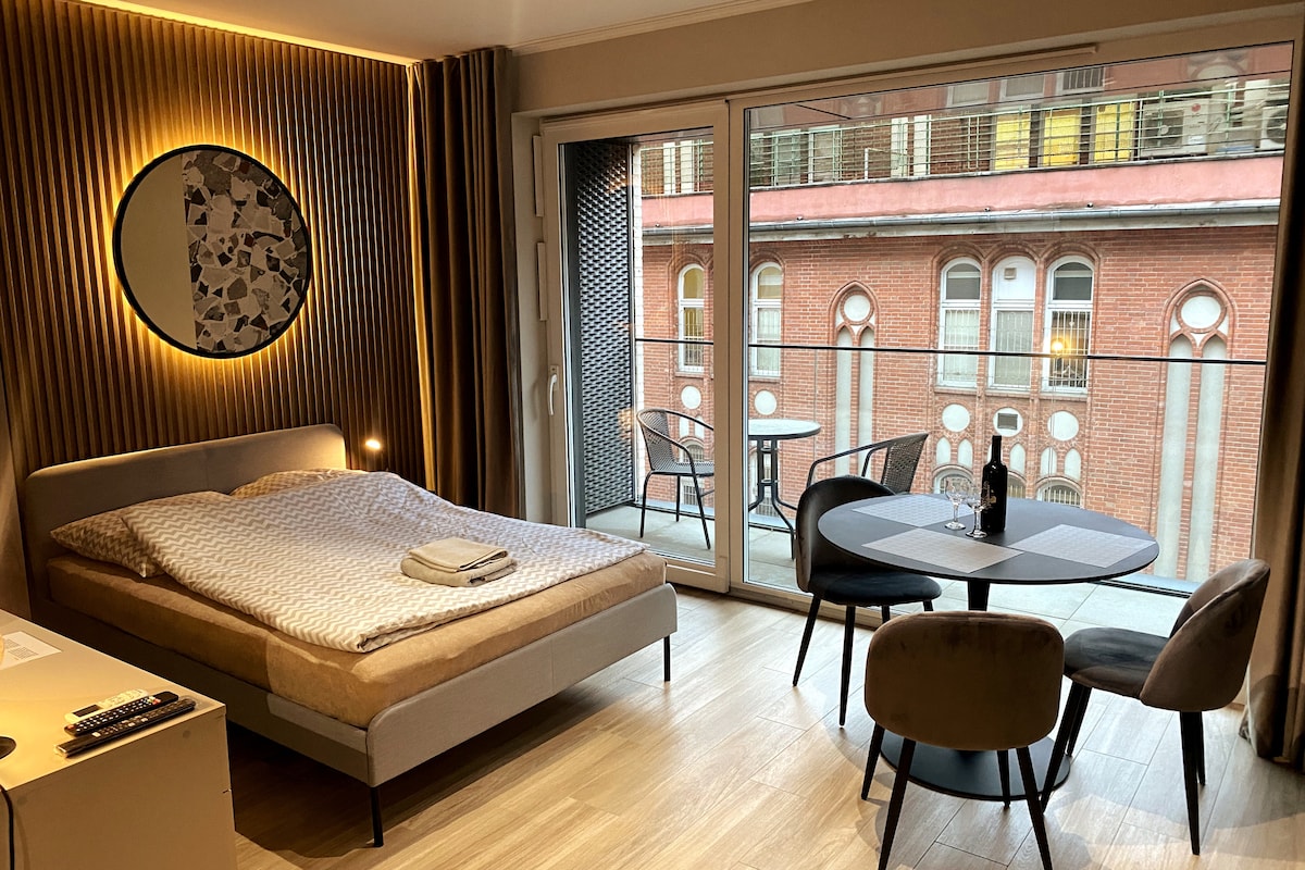 Studio baru dengan balkoni dan tingkat tengah di bangunan yang telah diubah suai di pusat bandar, betul-betul di sebelah Universiti Seni. Beberapa minit ke Dataran Lama. Akses mudah dengan trem dari Stesen Kereta Api Utama dan lapangan terbang. Terdapat lif di dalam bangunan. Bangunan ini adalah tempat jenayah dalam novel jenayah Ryszard Ćwirlej bertajuk Anda mendapatnya seperti di bank.