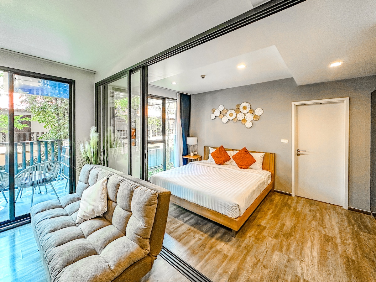 Tenang di tengah-tengah kesibukan, lokasi utama Phuket Patong yang sibuk, kolam renang & gimnasium double infiniti, 1 bilik tidur 1 ruang tamu yang selesa dengan bilik tab mandi dapur + keselamatan 24 jam