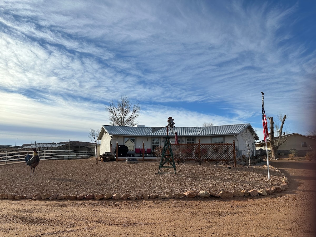 We are a little bit of Country Living, set on 3 acres. Kami tinggal berdekatan sekiranya anda memerlukan kami. Rumah yang Baru Diubah Suai ini mempunyai banyak kemudahan, haiwan ladang (yang mengeluarkan bunyi ladang), telur segar apabila tersedia, dan banyak tempat letak kereta! Terdapat laluan masuk yang menarik. Rumah ini dilengkapi sepenuhnya di dapur, bilik tidur, bilik mandi, & Dobi. Kami berada beberapa minit dari semua yang ditawarkan oleh Page & Lake Powell. Kami mesra Keluarga & Haiwan Peliharaan. Duduk di tepi Lubang Api dan alami keselesaan kehidupan Negara!