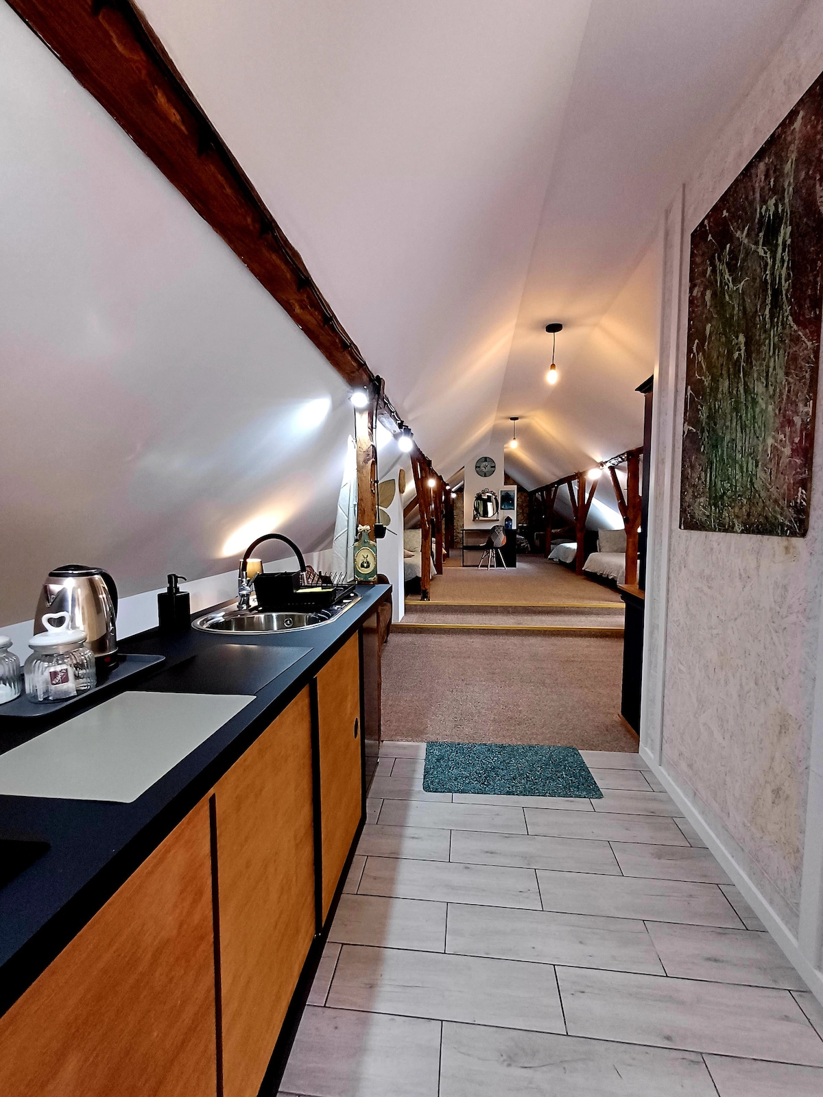 Apartament z prywatnym wejściem, parkingiem, strefą wypoczynku i SPA to wspaniałe miejsce do spędzenia wolnego czasu samodzielnie, w parze, z rodziną lub z grupą znajomych i przyjaciół. Apartament składa się z 2 sypialni, zamykanej i otwartej na salon, jadalni, kuchni, łazienki oraz romantycznego balkonu z widokiem na las i stadninę koni. Ciekawostka: jedna ściana tego stuletniego domu z piaskowca została zachowana w oryginalnej wersji. Można na niej znaleźć dobrze zachowane amonity.