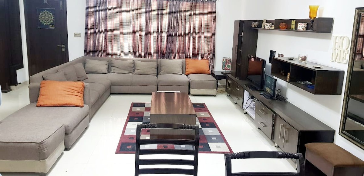 2BR yang luas dengan AC dan bilik mandi bersambung, 1 ruang tamu besar, dapur lengkap, ruang tamu & ruang makan yang selesa, balkoni persendirian. Terletak di kawasan kediaman yang selamat dengan pengawal bersenjata 24 jam di lorong. Berhampiran jalan makanan, 5 minit ke Haidary Mall, 20 minit ke Saddar/Tariq Rd, 15 minit ke Hospital Agha Khan. Berhampiran dengan masjid & semua kemudahan. Penghawa dingin mengenakan caj tambahan). WiFi berkelajuan tinggi, sandaran penjana, tiada kekurangan air.