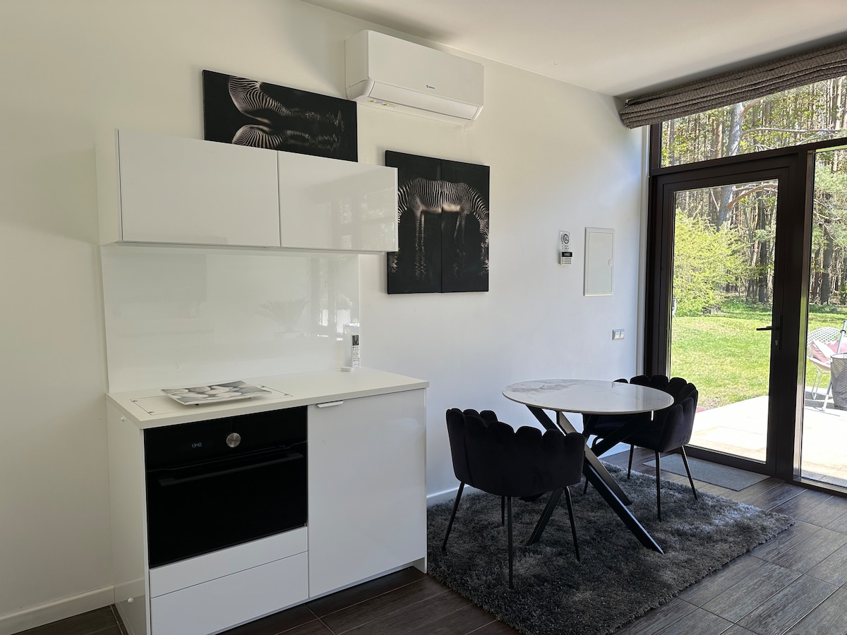 Bercuti ke studio menawan ini di kompleks Mano Jūra 2, hanya 10 minit berjalan kaki dari Laut Baltik. Ruang moden 28 meter persegi termasuk teres 27 meter persegi, sesuai untuk pasangan atau keluarga kecil dengan katil queen dan katil sofa. Dengan bayaran tambahan, nikmati tab mandi air panas, jakuzi, sauna, gril BBQ, ketuhar pizza, skuter elektrik dan basikal. Terletak di kejiranan Kunigiškiai yang tenang, studio ini berhampiran pantai, laluan basikal, dan hutan pain. Sesuai untuk percutian tepi pantai yang tidak dapat dilupakan.