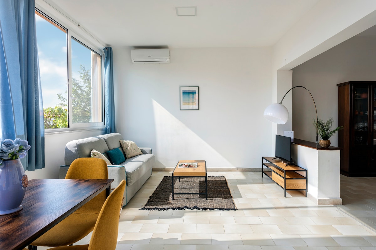 Cozy apartment with a sea-view terrace in Addaura, just minutes away from Mondello. Located on the raised ground floor of a villa, it features two furnished outdoor spaces: one with a dining area accessible from the kitchen, and another with a relaxation area connected to both the living room and bedroom. The entrance leads to a bright living zone with a sofa bed, TV, and dining table, alongside a fully equipped kitchen. Two bedrooms and a bathroom with a shower complete the home