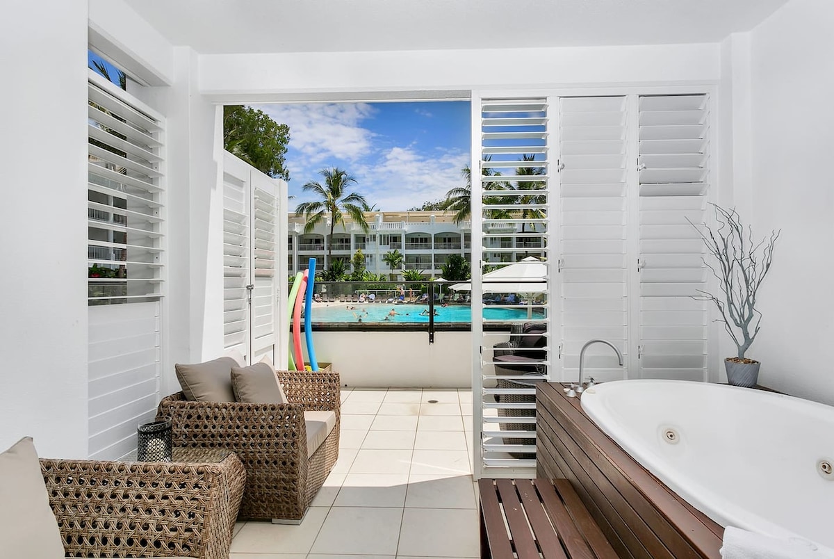 Apartmen tingkat bawah saya menghadap kolam renang besar yang dibarisi pokok di resort "Drift", dan mungkin yang paling dicari di kompleks ini. Resort ini terletak di seberang jalan dari pantai di Palm Cove dan dikelilingi oleh kafe & restoran, dan mempunyai akses mudah ke padang golf, sukan pengembaraan berhampiran, dan Great Barrier Reef & Daintree Rainforest yang ikonik. Palm Cove terletak di tepi pantai berpasir sepanjang 4km yang dipagari kelapa sawit 20 minit ke utara Cairns CBD & Airport.