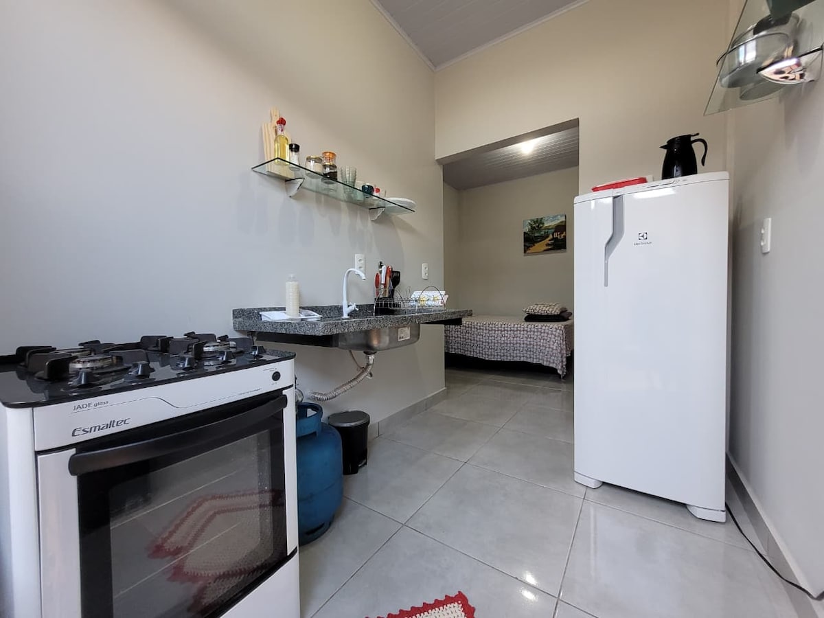 Micro Casa com garagem Local tranquilo, ideal para casais ou viajantes que buscam um espaço funcional e bem equipado. O ambiente conta com cama de casal, ar-condicionado e Wi-Fi. A cozinha é completa, equipada com geladeira, fogão e utensílios, permitindo preparar refeições com facilidade. Há também mesa com cadeiras, para refeições ou trabalho remoto. O banheiro é privativo, trazendo mais comodidade durante sua estada. Área comum compartilhada com mais duas unidades. Vaga de garagem.