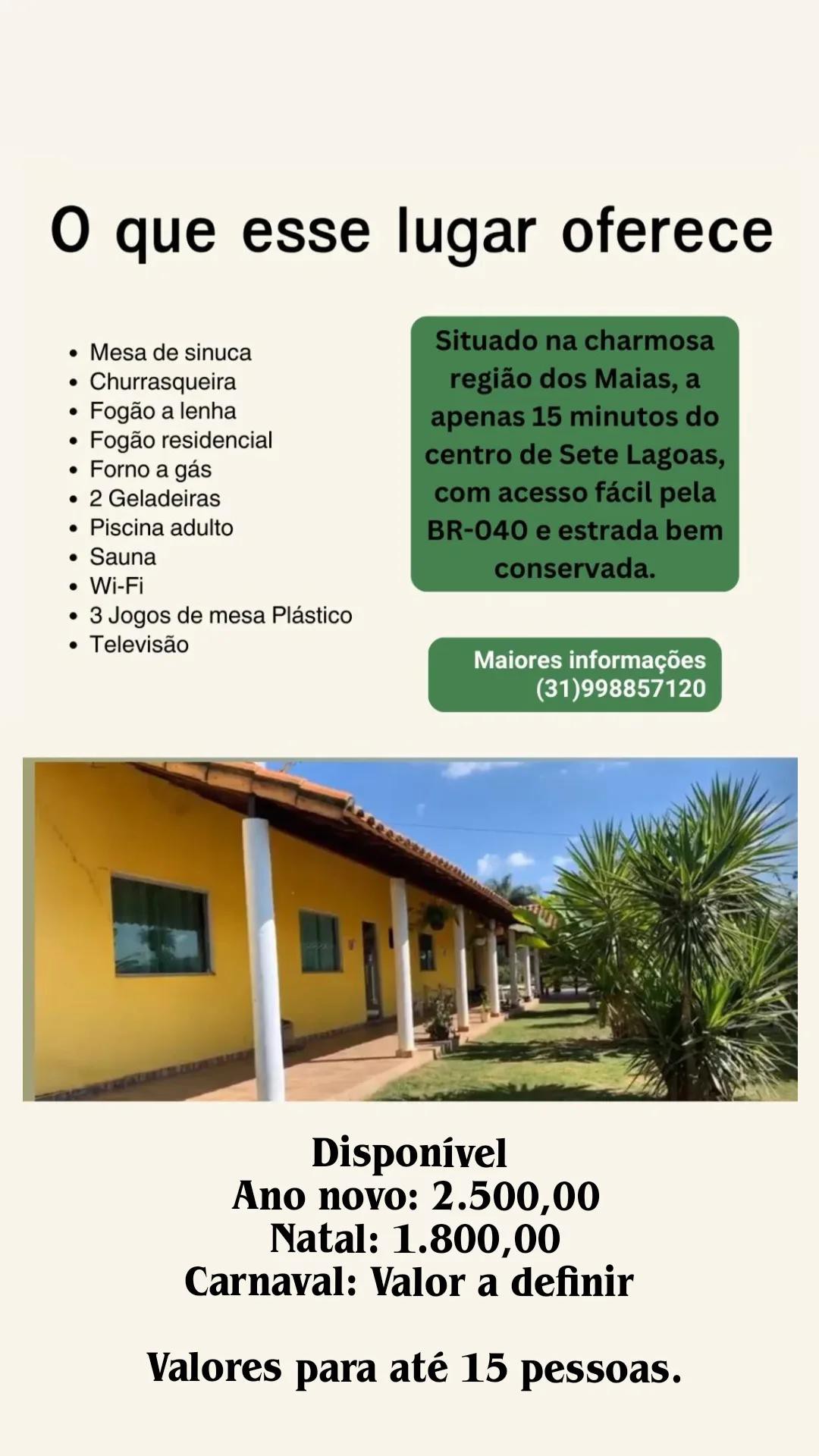 Sitio com piscina em sete lagoas - Minas Gerais. Em frente ao Clube Pousada do Sol em uma região muito tranquila e segura. Oferecemos nossa chacara para alugar com um terreno de 3.000 metros quadrados, duas piscinas, campo de futbol e volei. Area de churrasco. 5 quartos e 4 banheiros. 2 quartos com cama de casal, 1 quarto com 3 camas de solteiro e 2 quartos com duas camas de solteiro, e 5 colchoes. Otima INTERNET em toda a area. ATENÇÃO: PACOTES DE ANO NOVO OU CARNAVAL, MINIMO 5 DIAS!