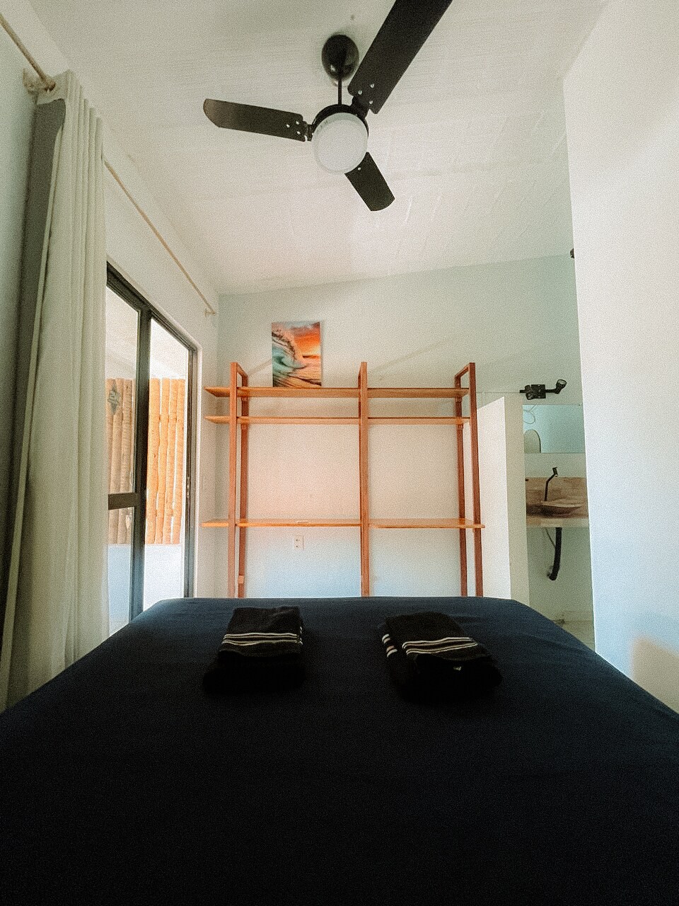 Suíte para 1/2 pessoas, com cama de casal, ar-condicionado, ventilador, banheiro privativo e chuveiro quente. O quarto está localizado no primeiro andar e possui varanda com rede e vista para o jardim da pousada. Ideal para casais ou viajantes que procuram tranquilidade perto da praia.